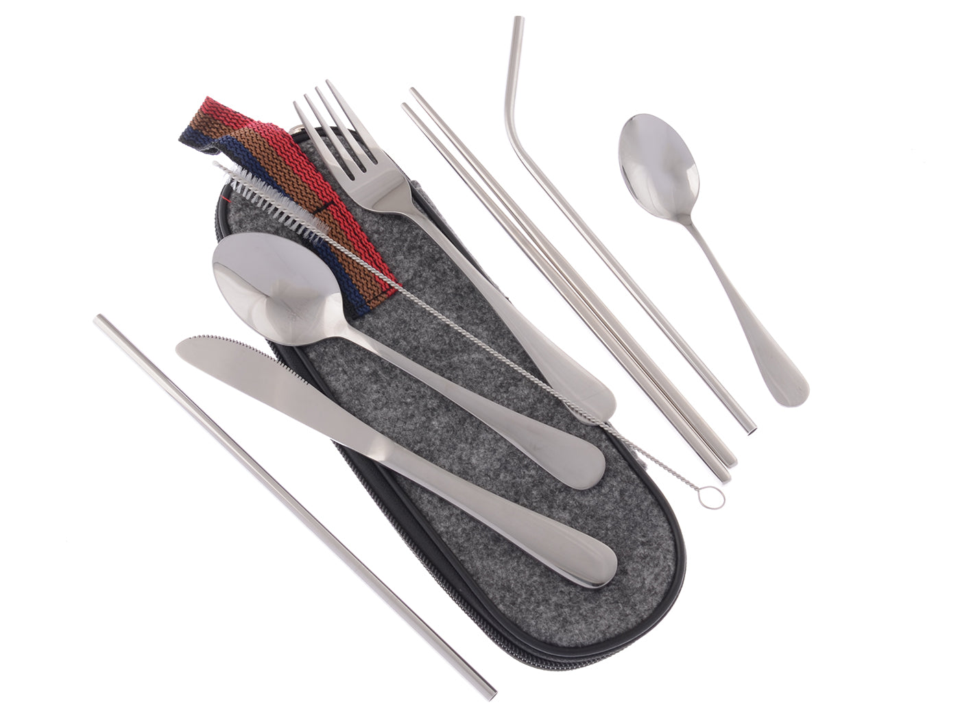 - Lightweight and Portable. This travel flatware set includes knife, fork, spoon and carrying case, great for travel, camping, school or work.