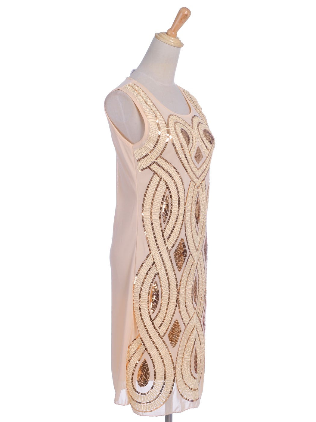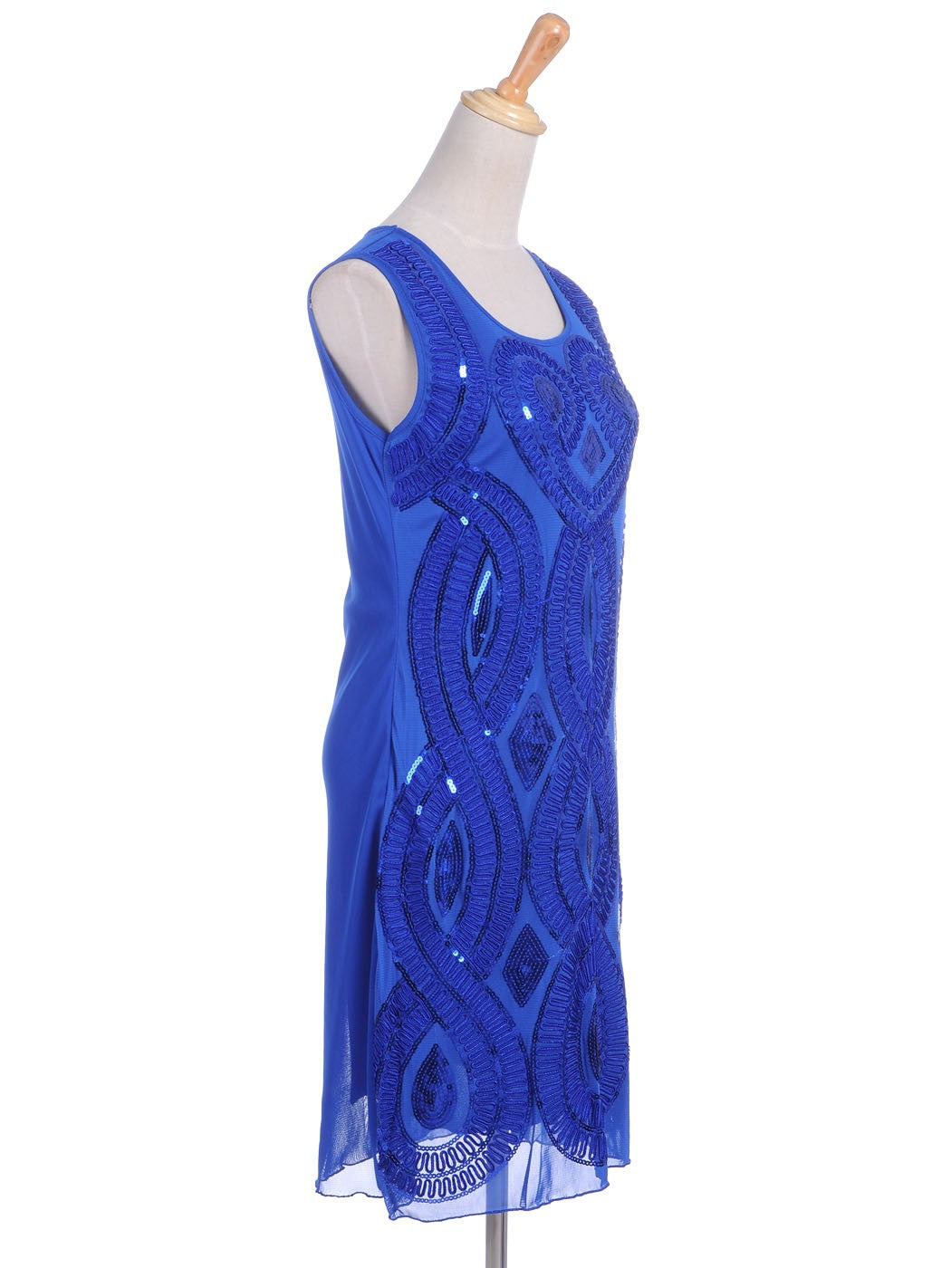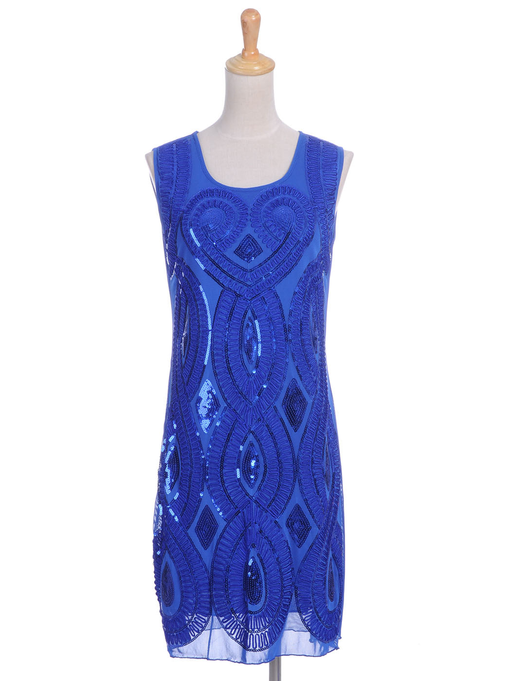 - ROARING 20s INSPIRED COCKTAIL DRESS. Recreate the straight silhouette look of the 1920s . This cute and sexy flapper dress features sequin and ribbon embellishments echoing art deco patterns on the front with a solid color back. Available in three stunning colors: beige, blue, red.