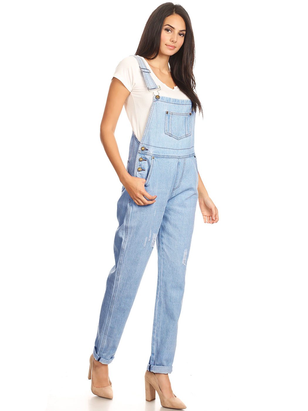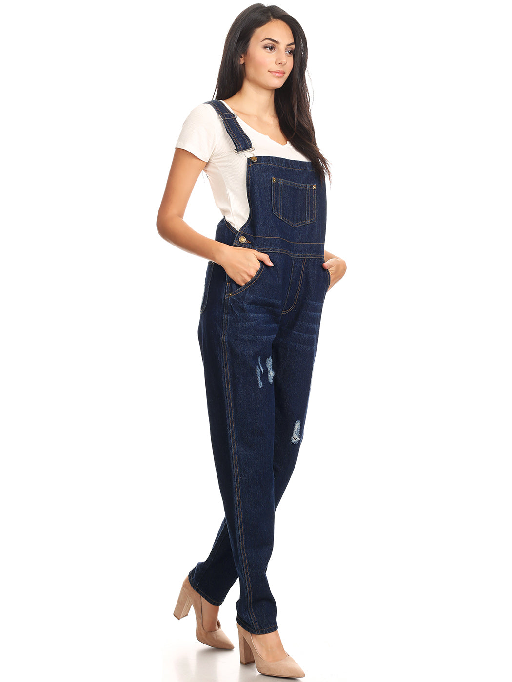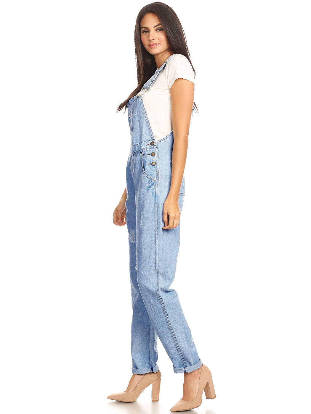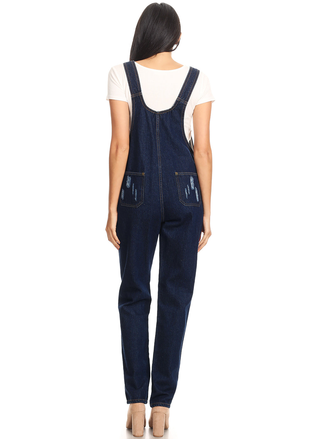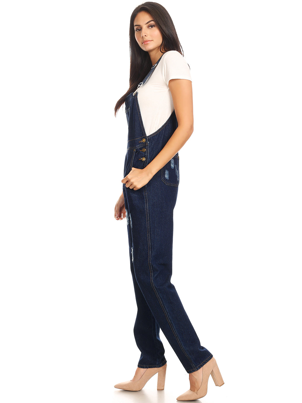- DISTRESSED DENIM FOR A VINTAGE LOOK. Just one of those classic pieces that you need in every wardrobe. These cute bib style overalls have a distressed finish to give it a fun, worn look while still being durable due to the high quality cotton used.