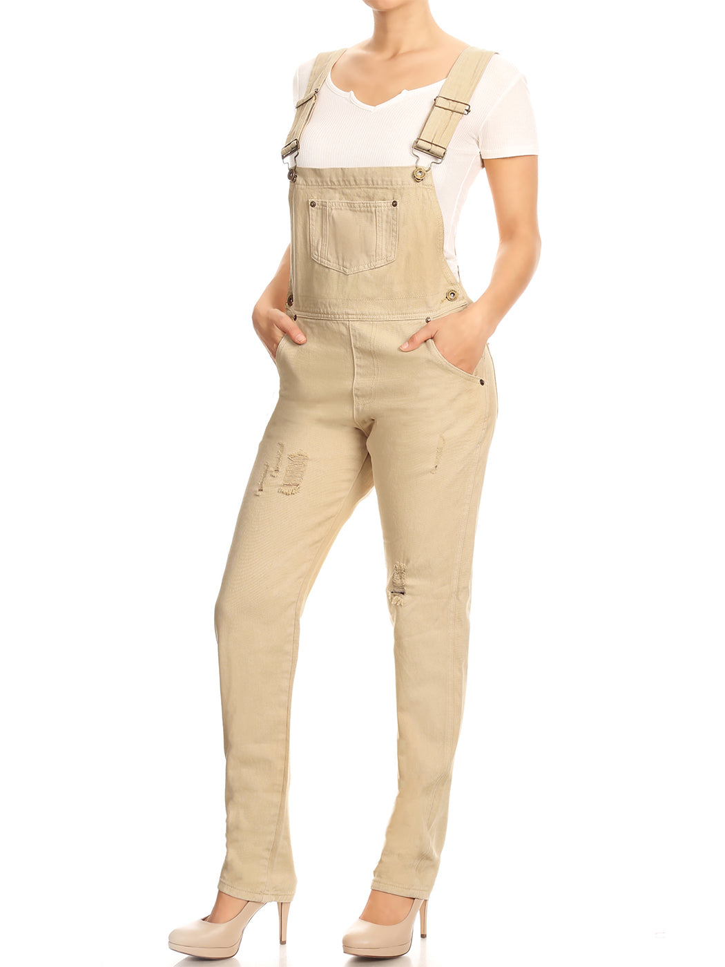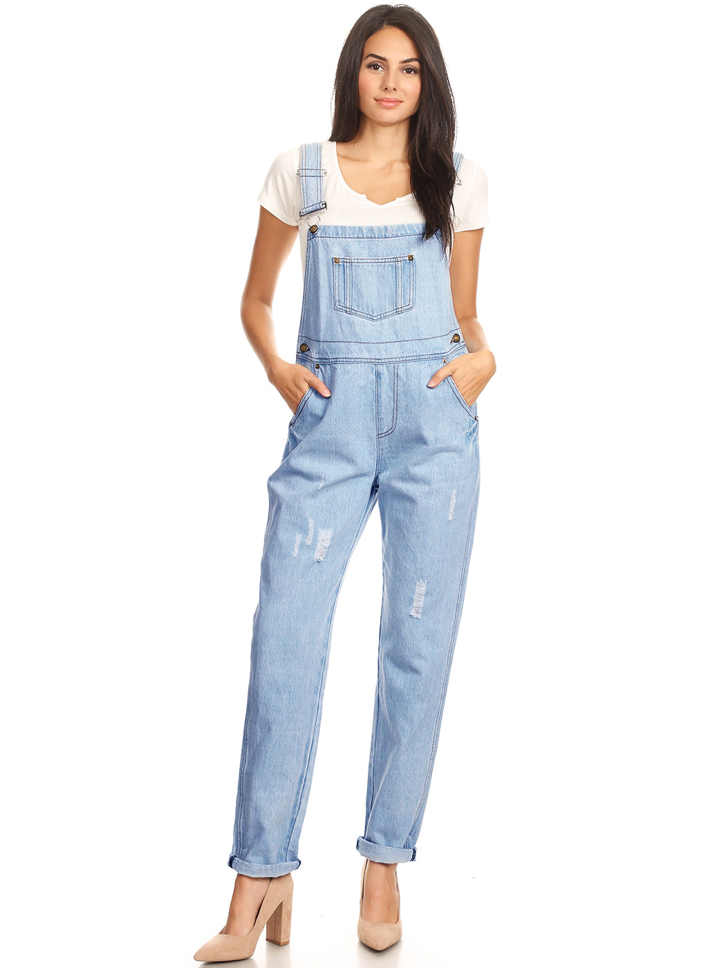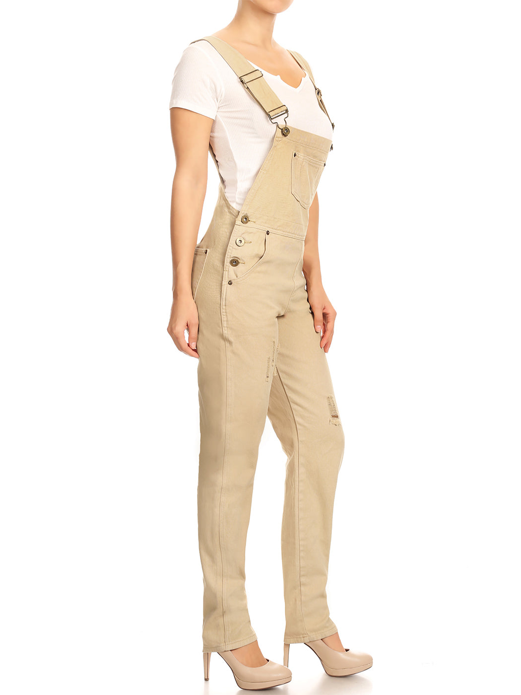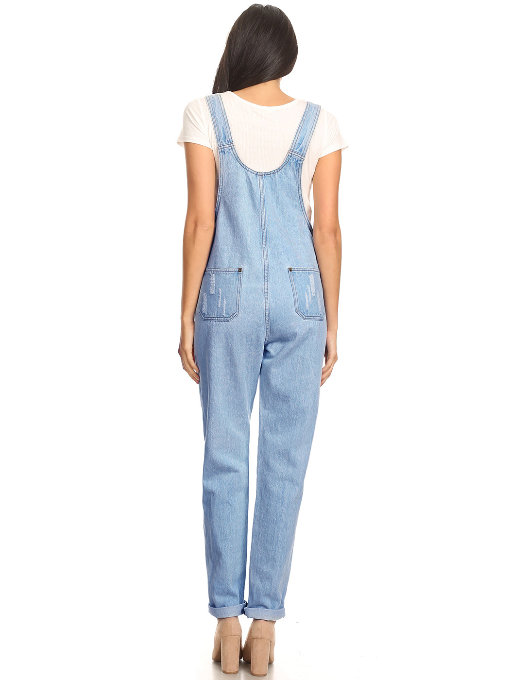- DISTRESSED DENIM FOR A VINTAGE LOOK. Just one of those classic pieces that you need in every wardrobe. These cute bib style overalls have a distressed finish to give it a fun, worn look while still being durable due to the high quality cotton used.
