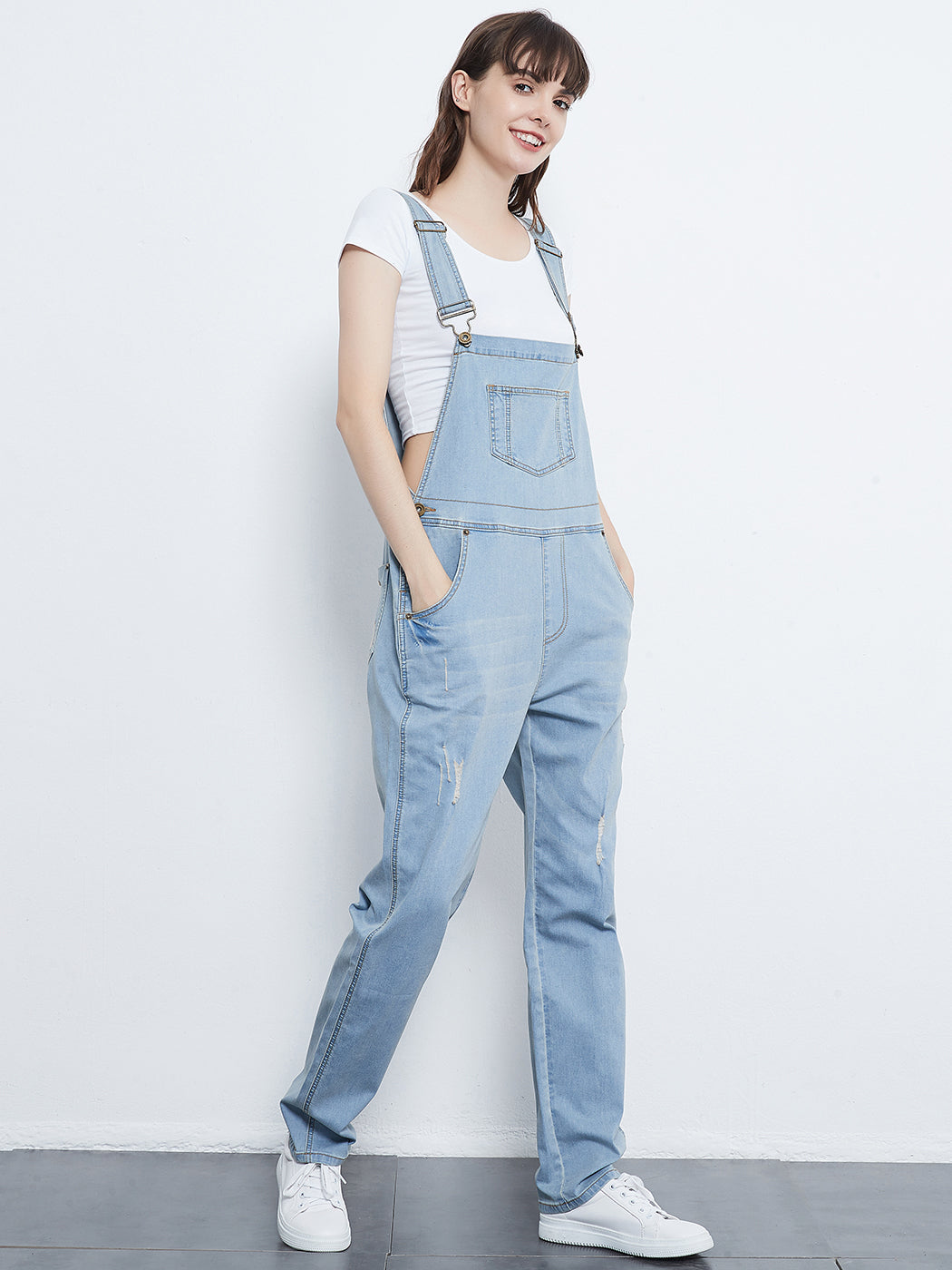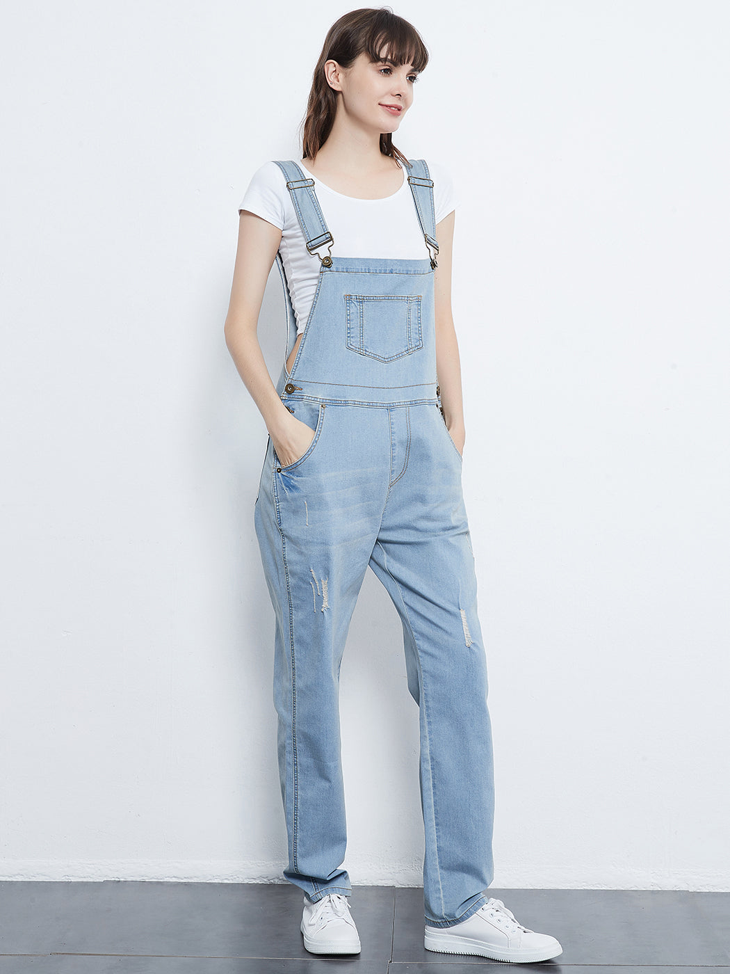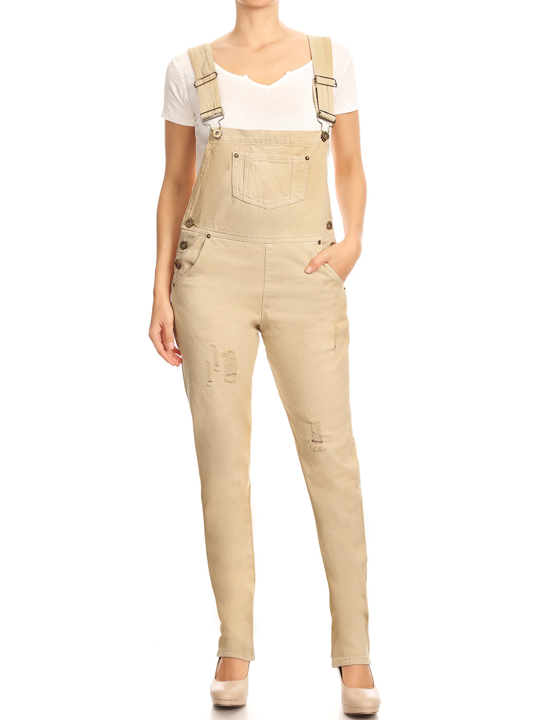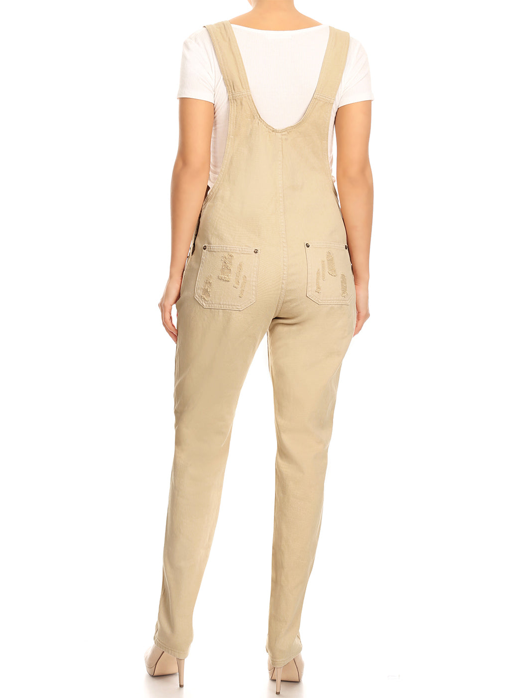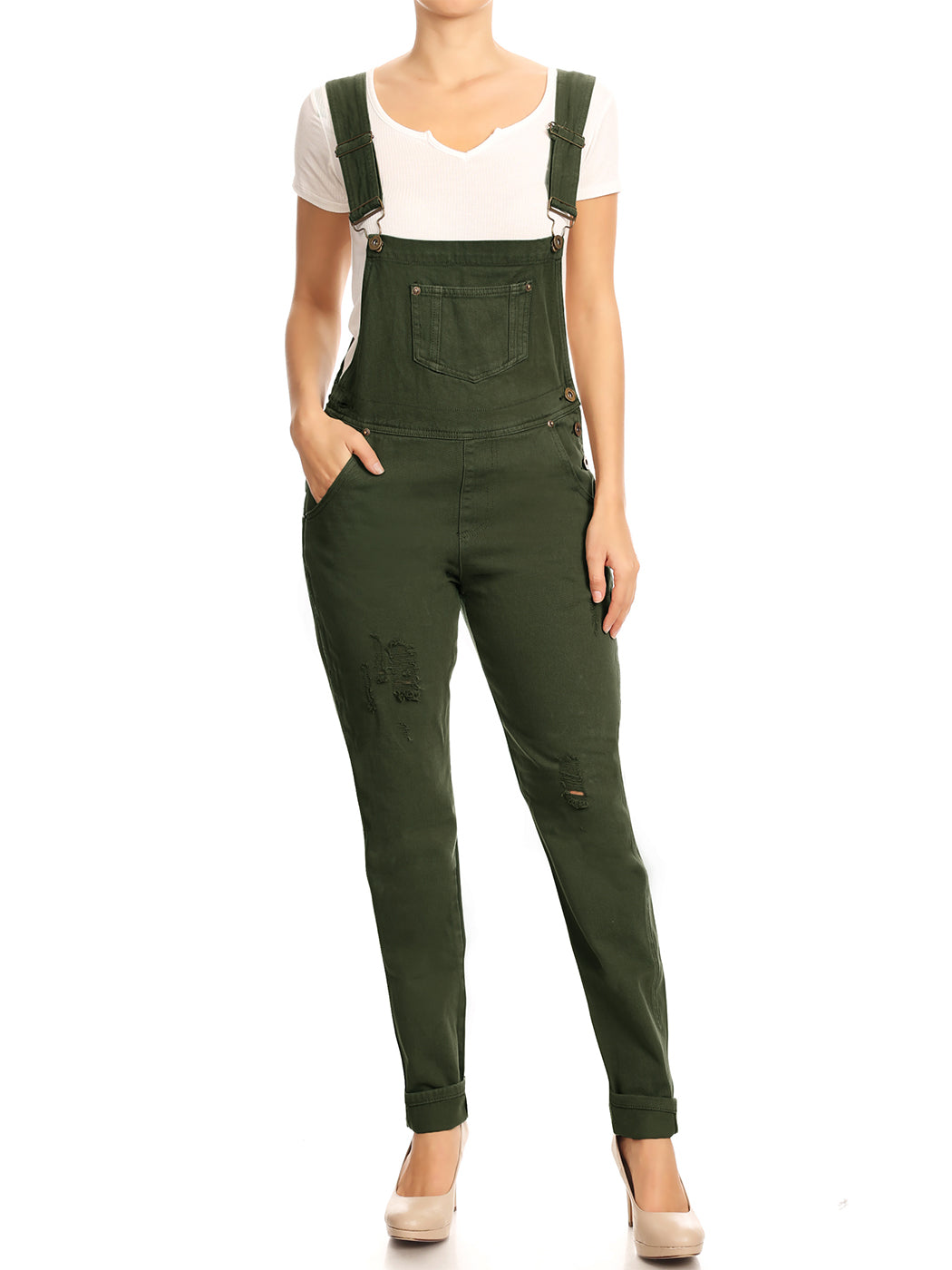 - DISTRESSED DENIM FOR A VINTAGE LOOK. Just one of those classic pieces that you need in every wardrobe. These cute bib style overalls have a distressed finish to give it a fun, worn look while still being durable due to the high quality cotton used.