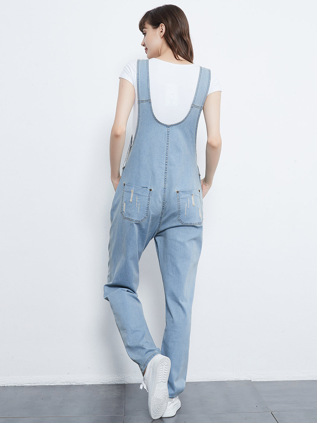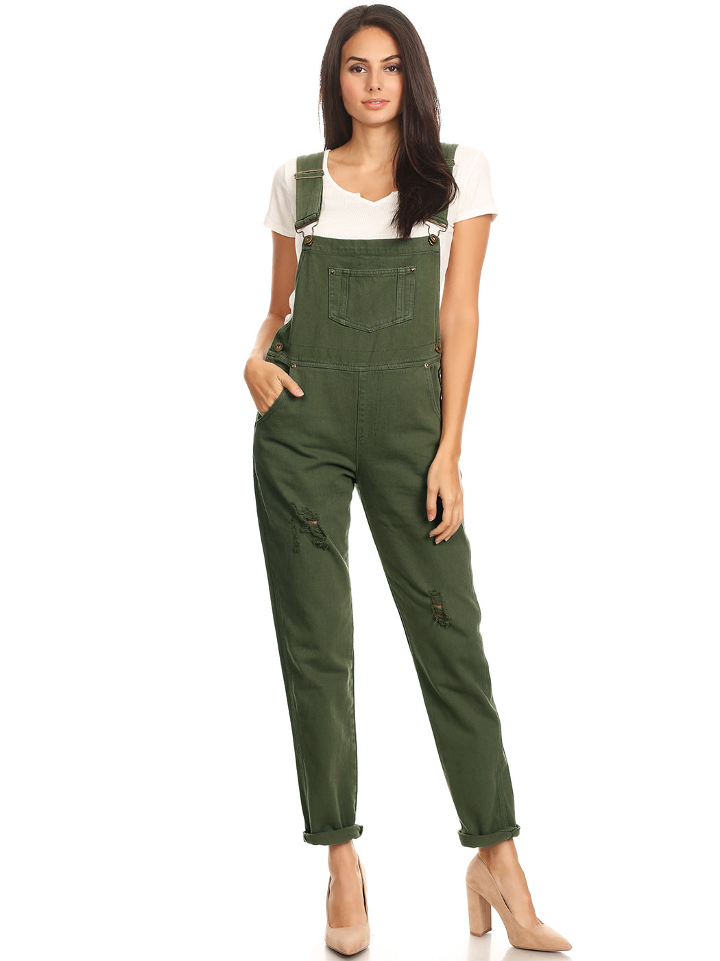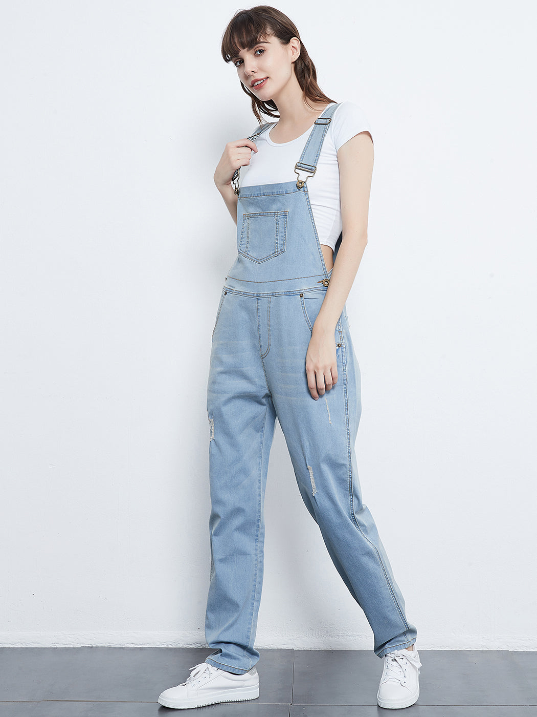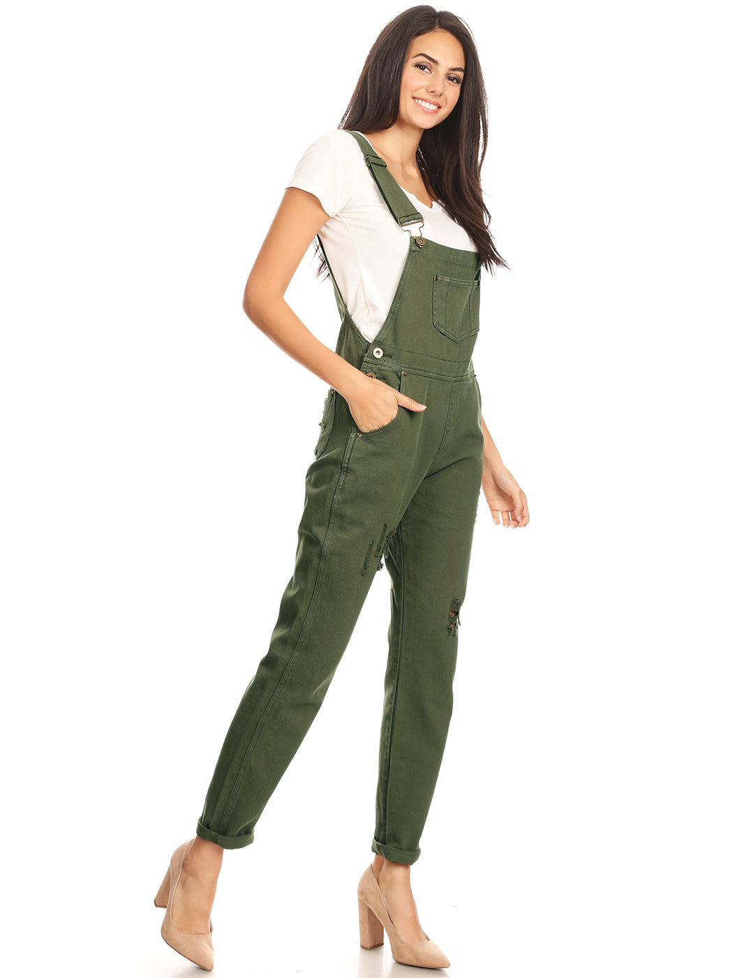 - DISTRESSED DENIM FOR A VINTAGE LOOK. Just one of those classic pieces that you need in every wardrobe. These cute bib style overalls have a distressed finish to give it a fun, worn look while still being durable due to the high quality cotton used.
