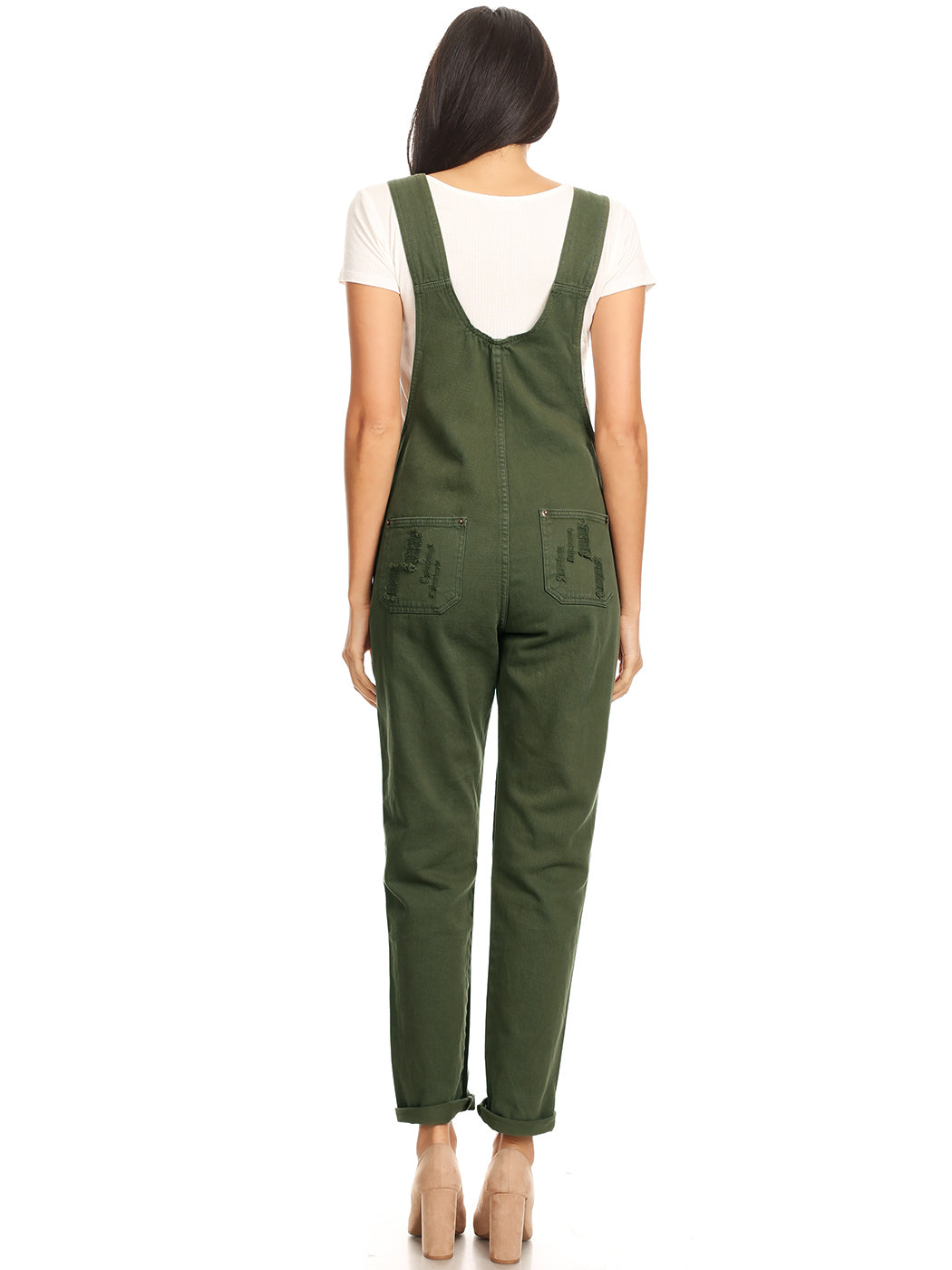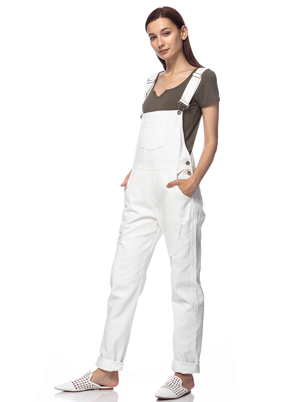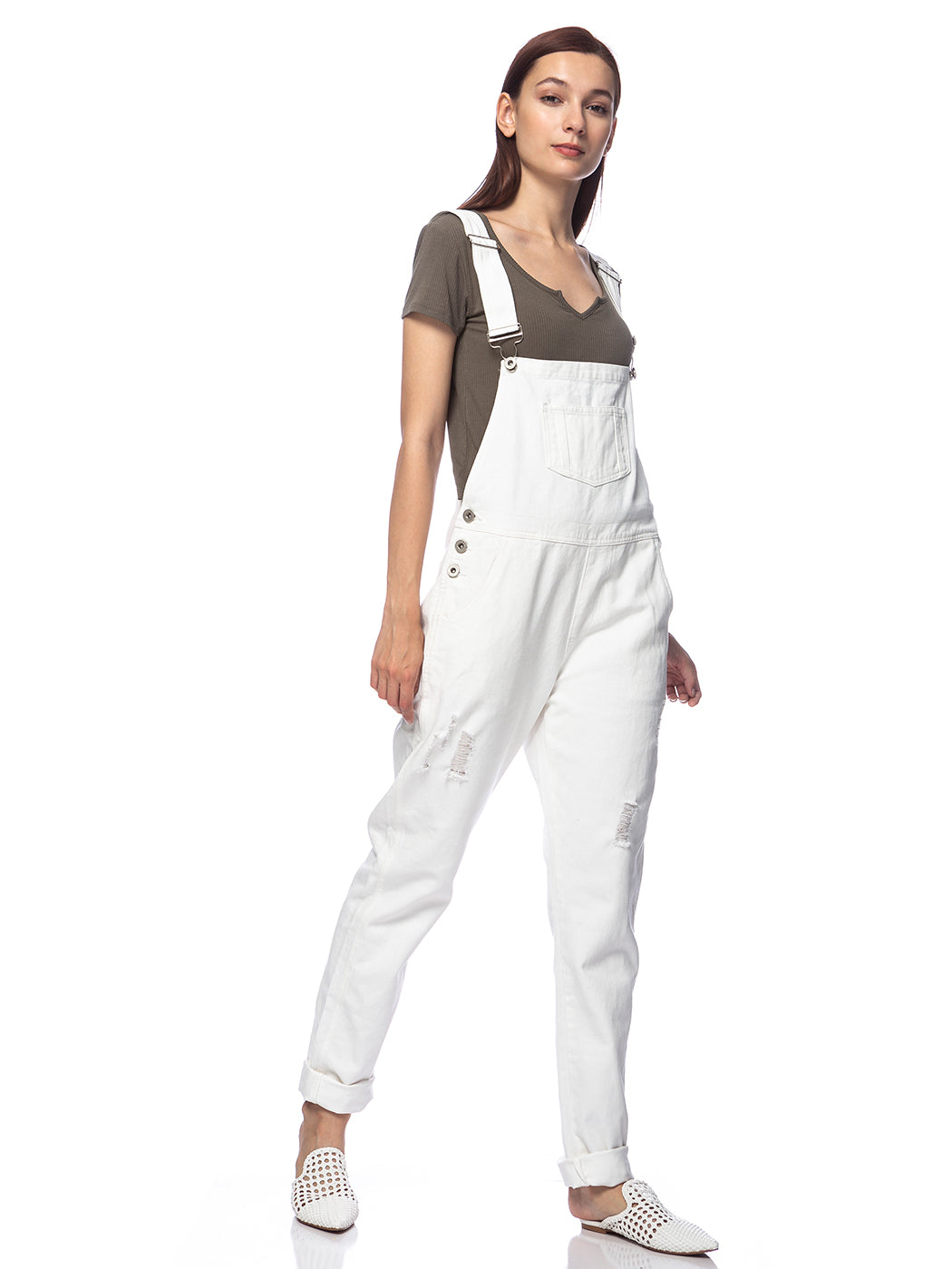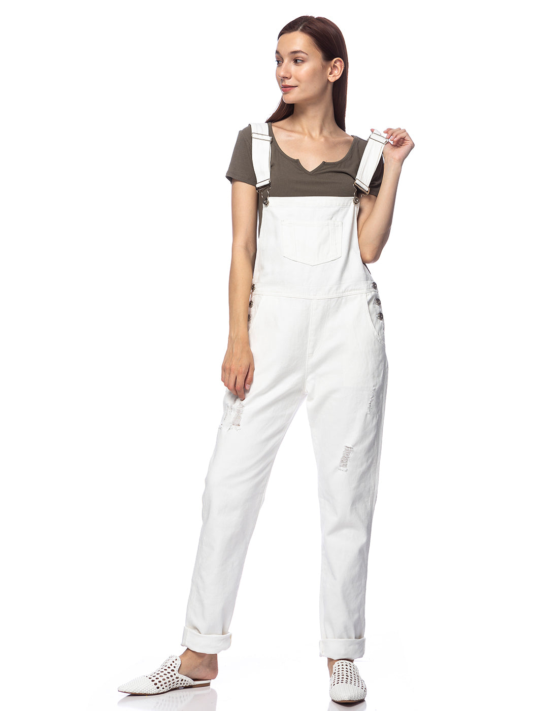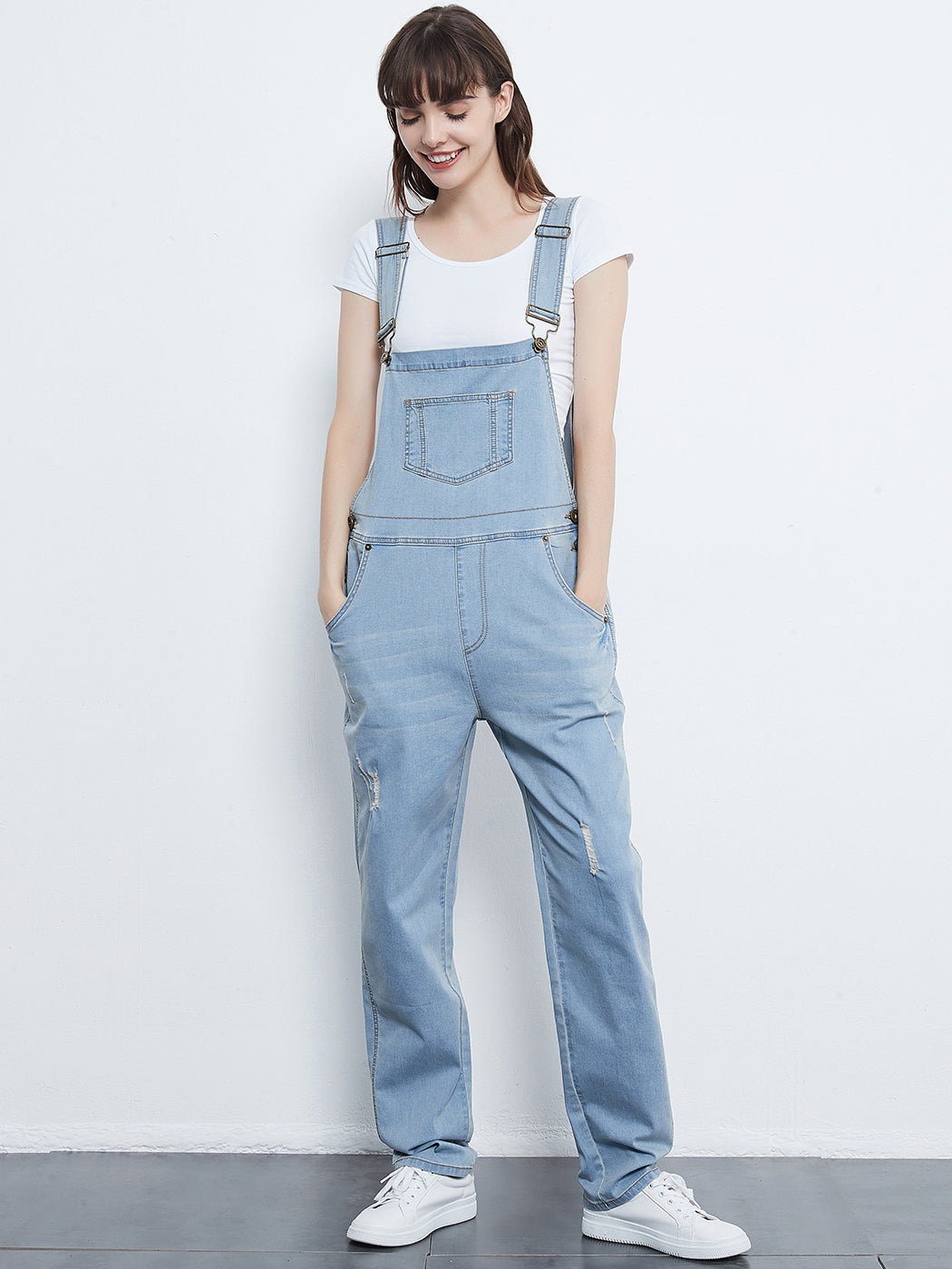 - DISTRESSED DENIM FOR A VINTAGE LOOK. Just one of those classic pieces that you need in every wardrobe. These cute bib style overalls have a distressed finish to give it a fun, worn look while still being durable due to the high quality cotton used.