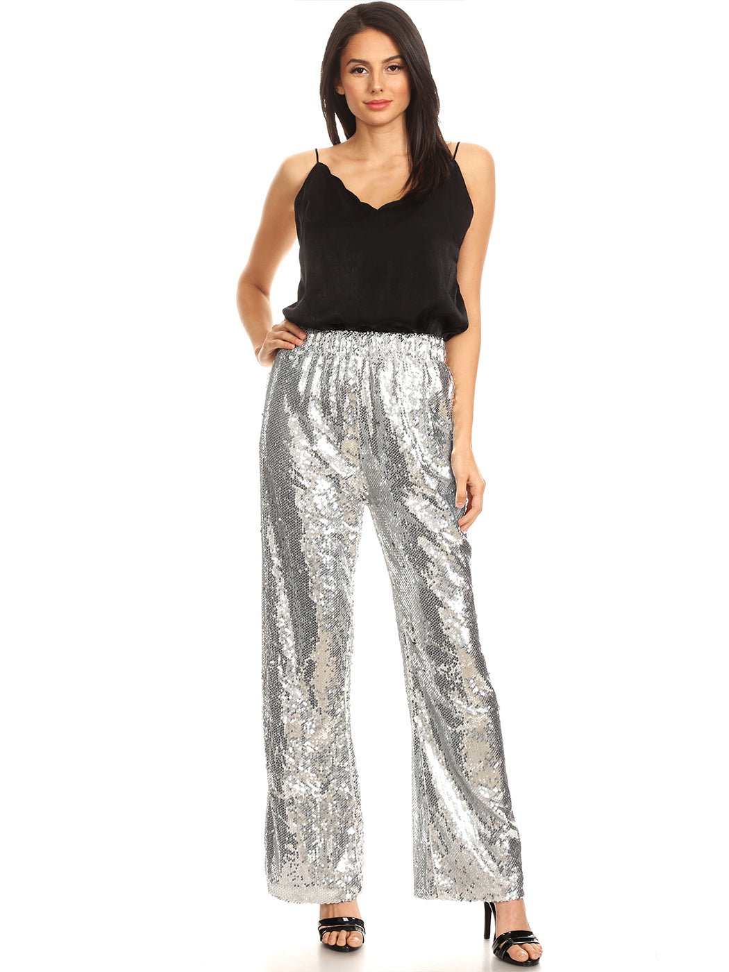 - DISCO PANTS - This extraordinary pair of flare pants features an elastic, stretchy waistband that allows for comfortable wear. Has a relaxed, wide leg fit that is perfect for long hours, day or night! There is never enough sparkle, especially when you are dressing to impress!
