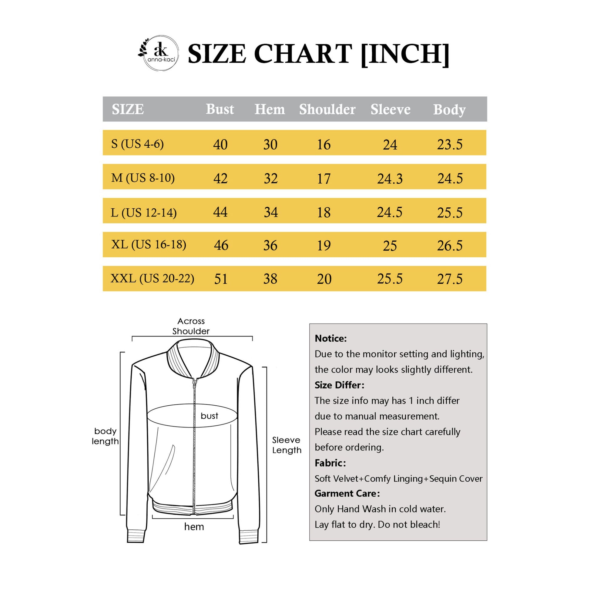 - Size Information: The model is 5'8", wearing size S (jacket length: 23.5", shoulder breadth: 16", sleeve length: 24"). She has a 34" bust,27" waist, and 32" hips.The size may has 1" differ due to manual measurement. Please check the size chart carefully before ordering this sequin jacket for women