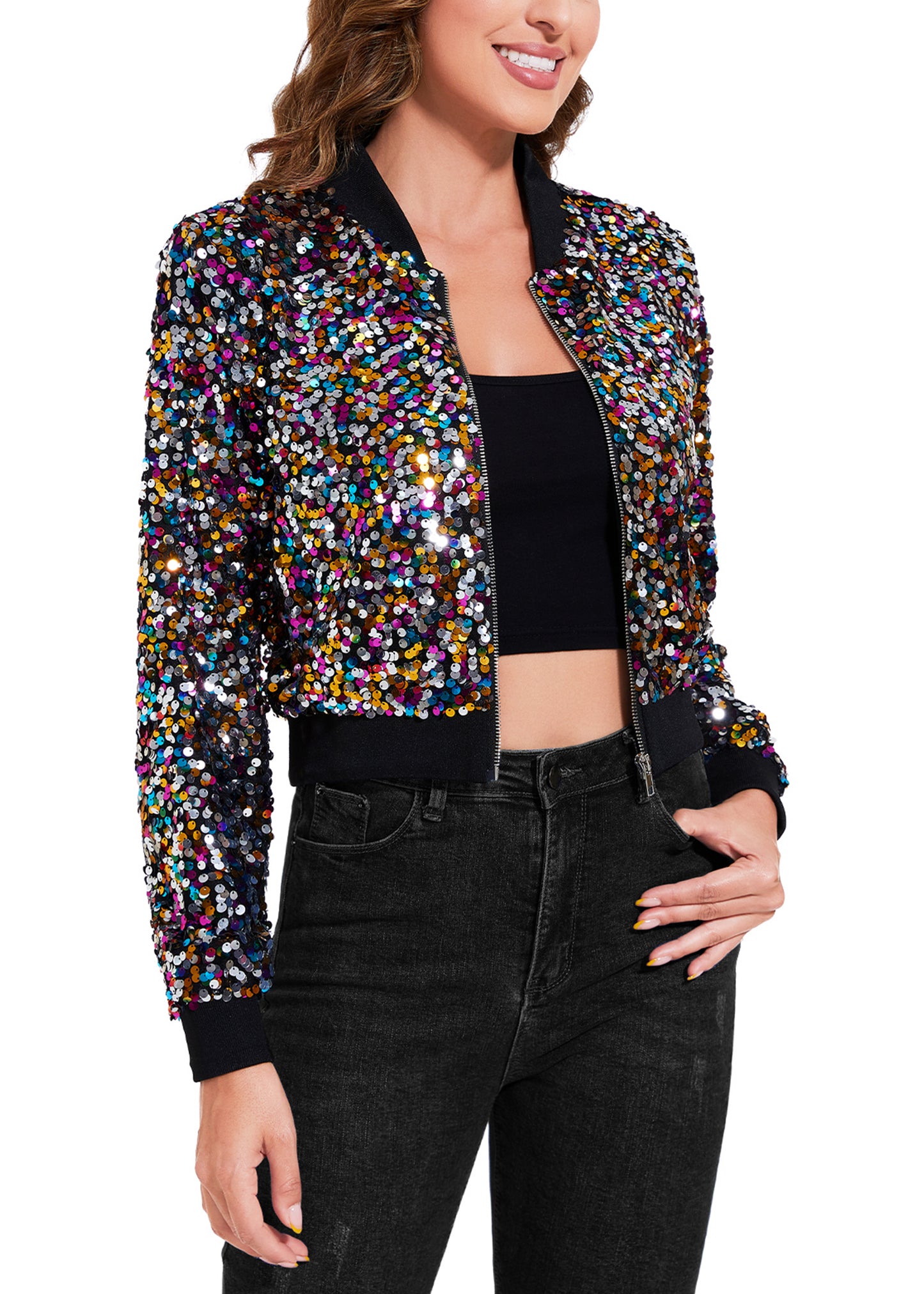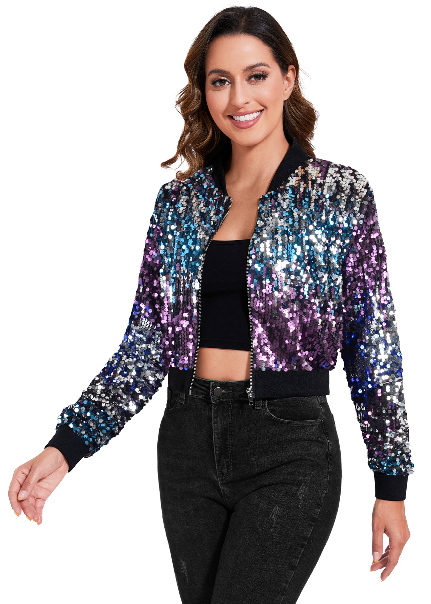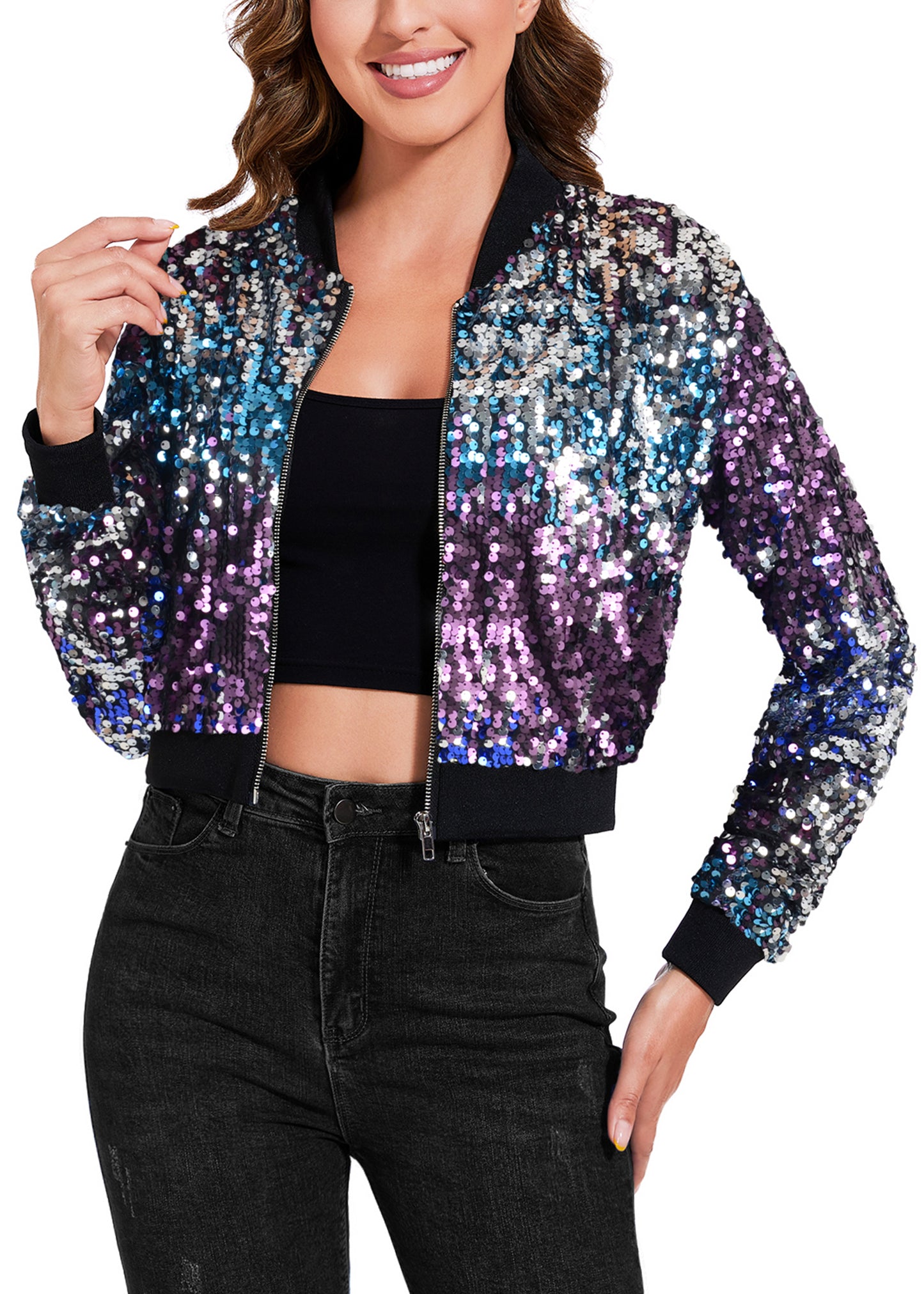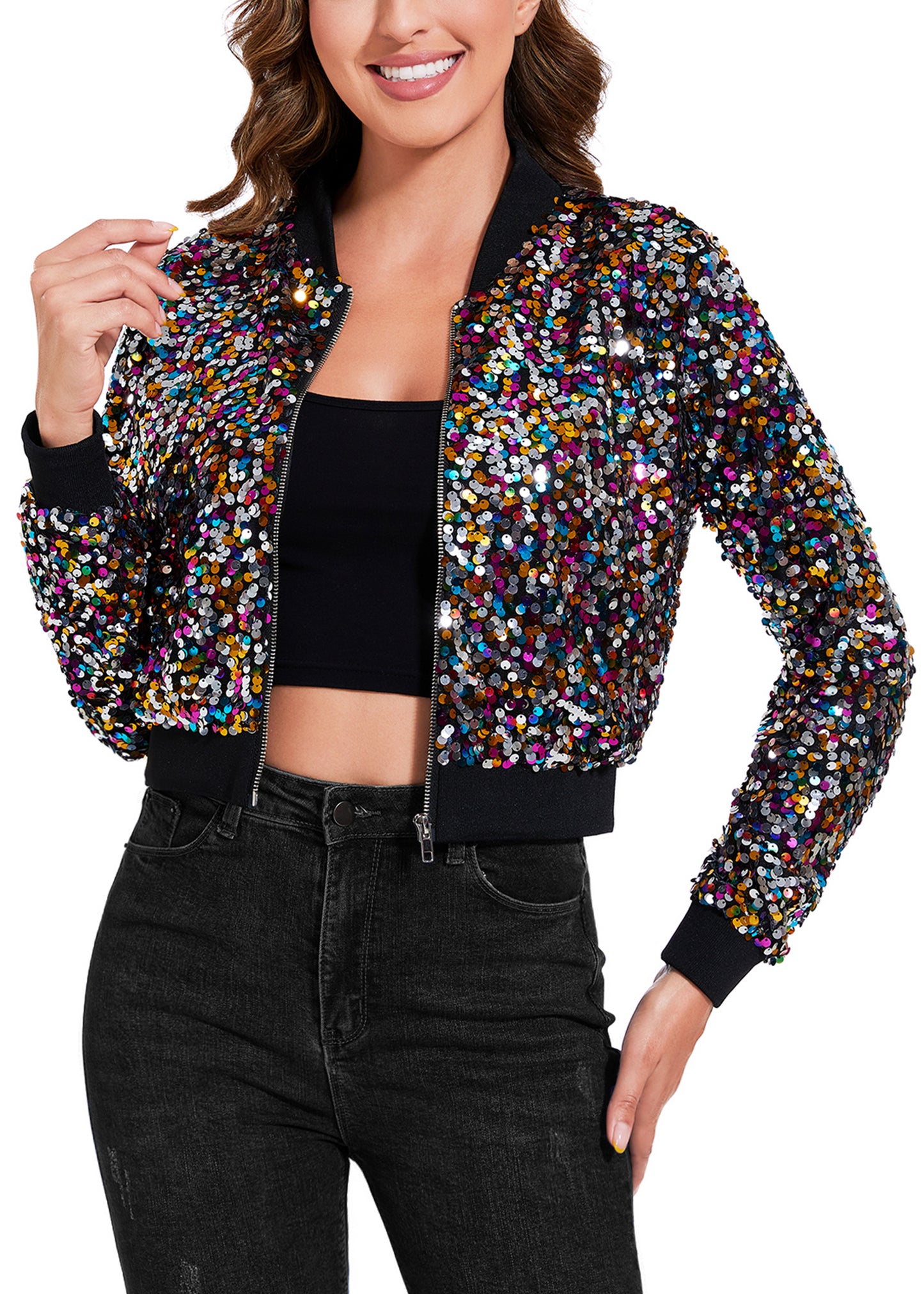 SPARKLY SEQUIN CROPPED JACKET. This sparkle bomber jacket is made of lightweight polyester material and embellished sparkle sequins, has a soft full lining that keeps you comfortable.