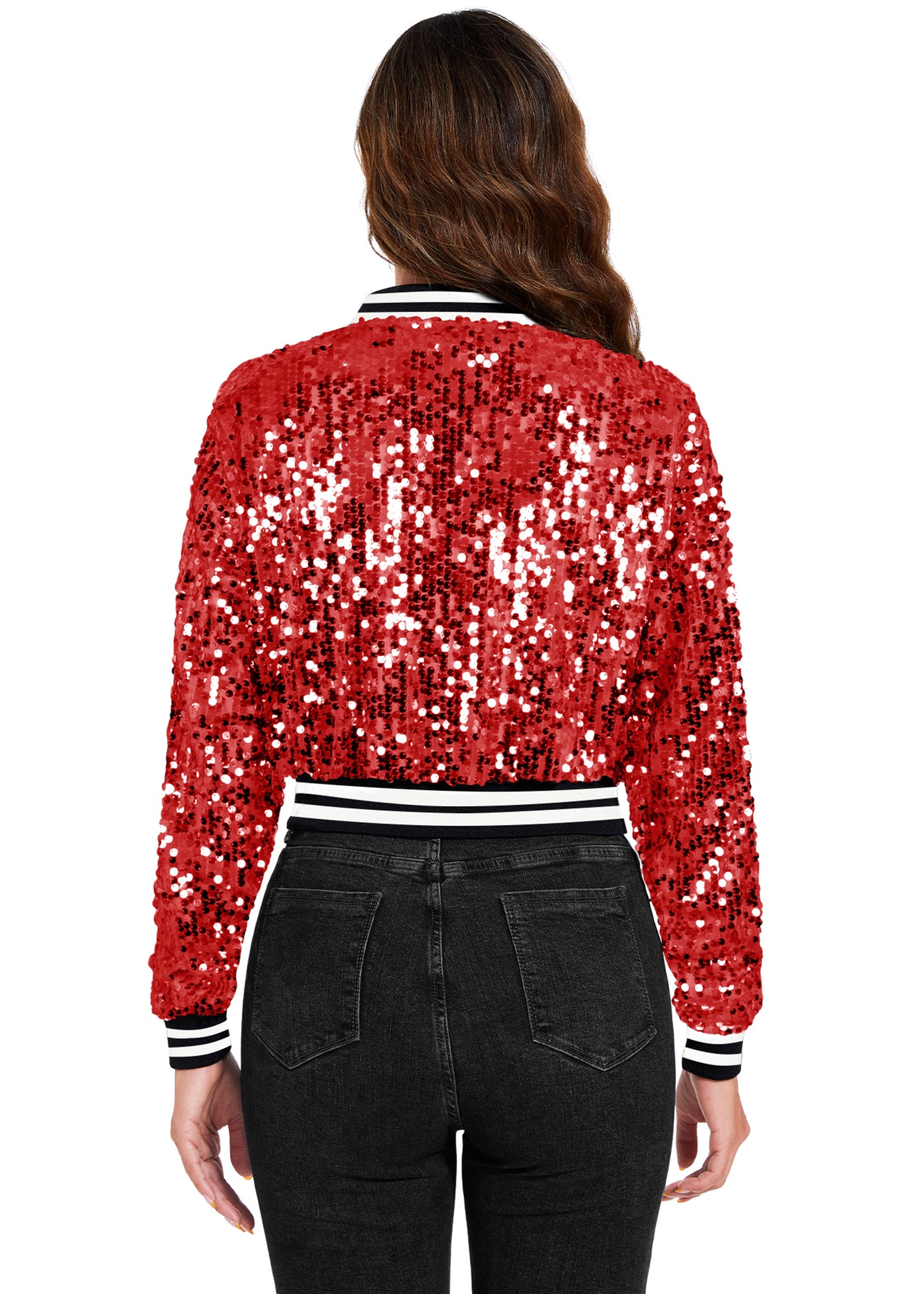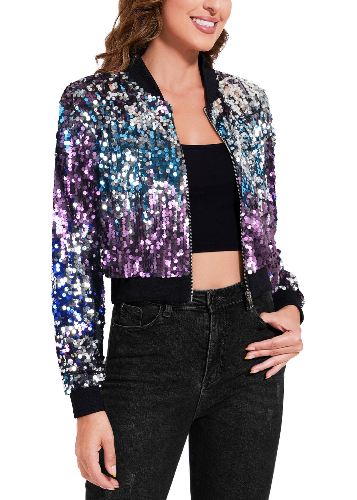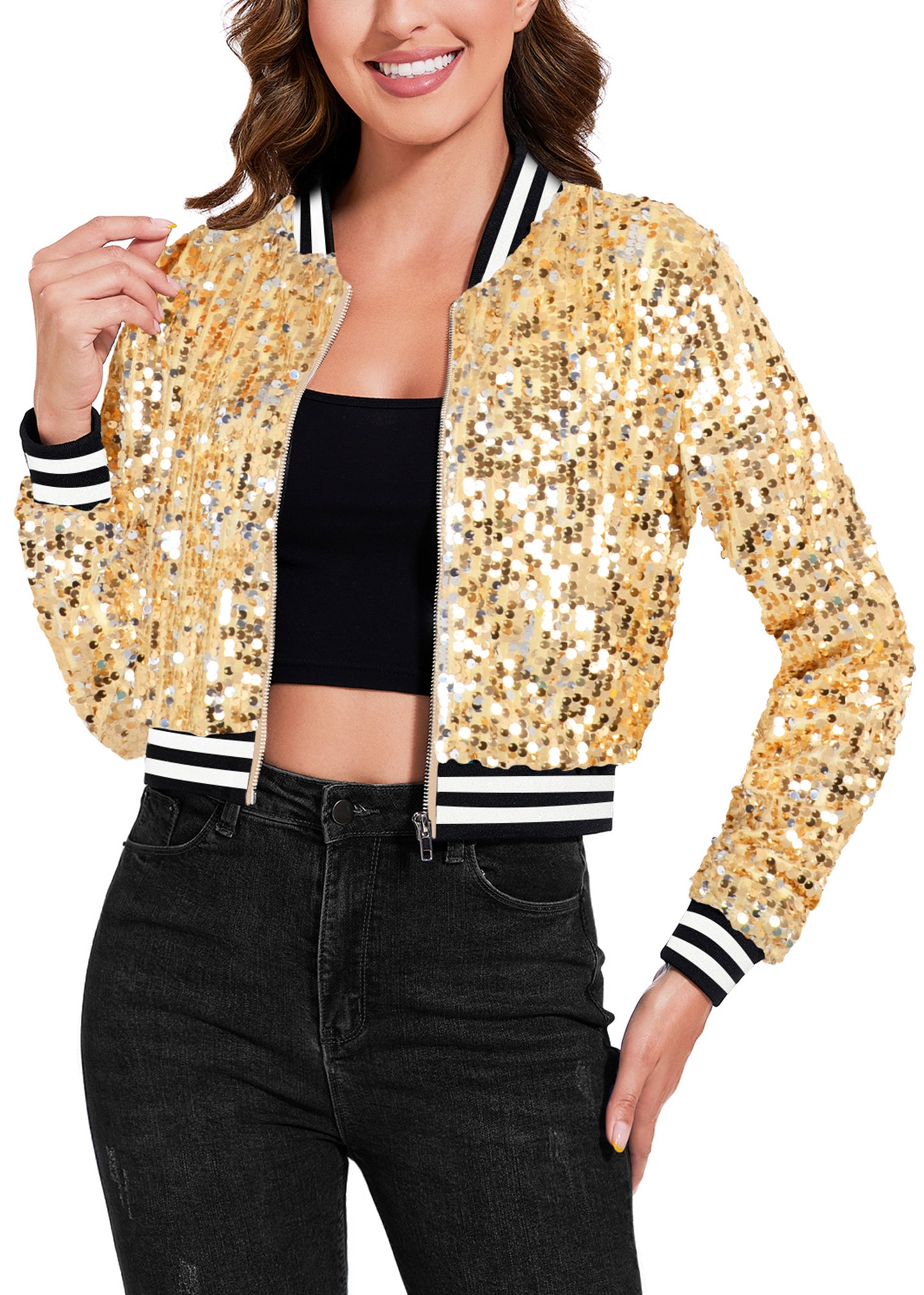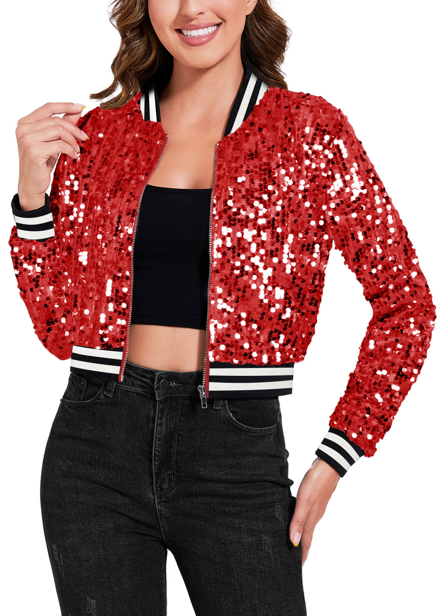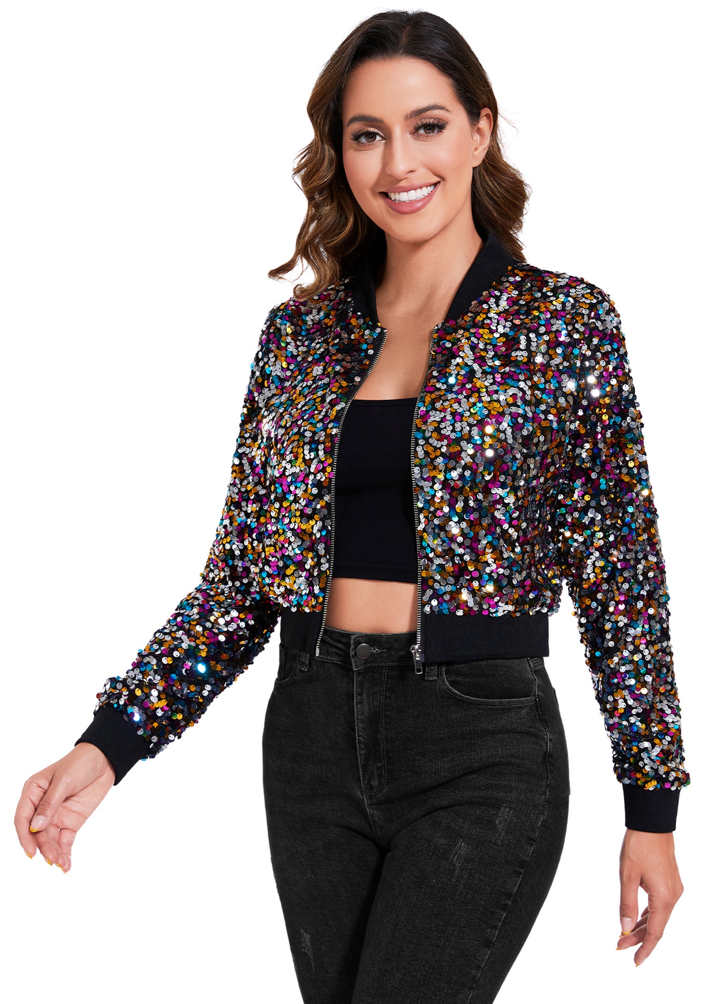 SPARKLY SEQUIN CROPPED JACKET. This sparkle bomber jacket is made of lightweight polyester material and embellished sparkle sequins, has a soft full lining that keeps you comfortable.