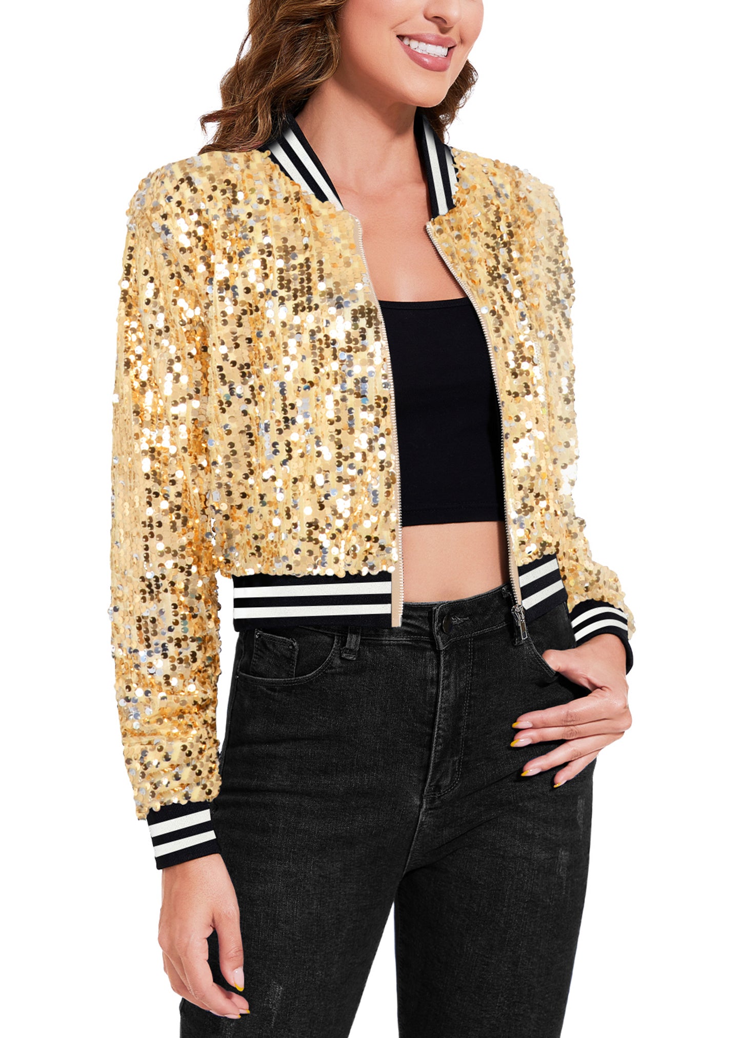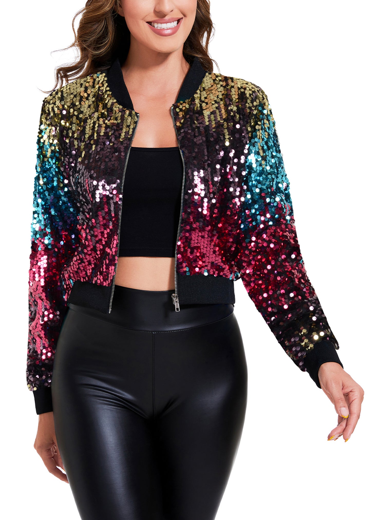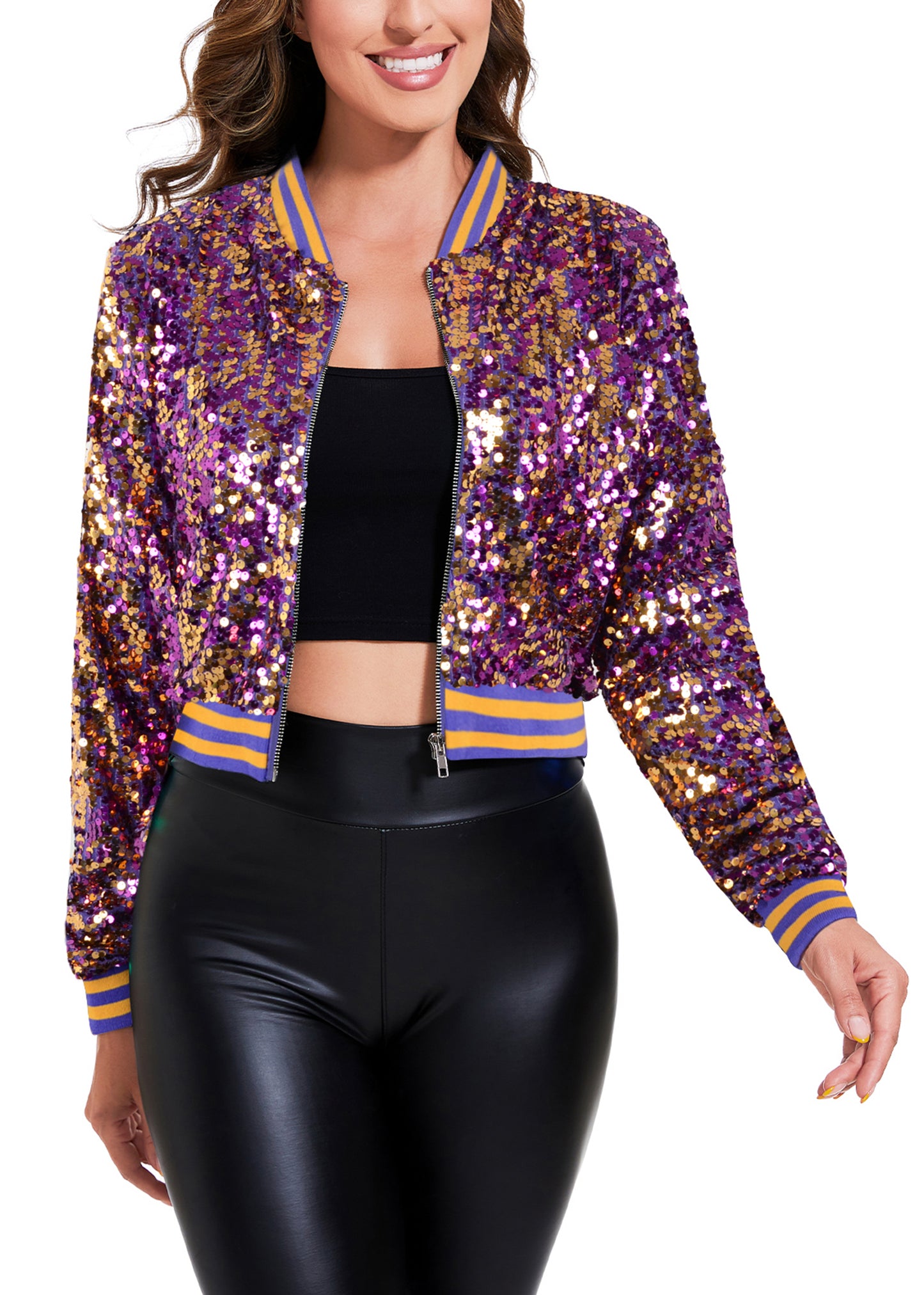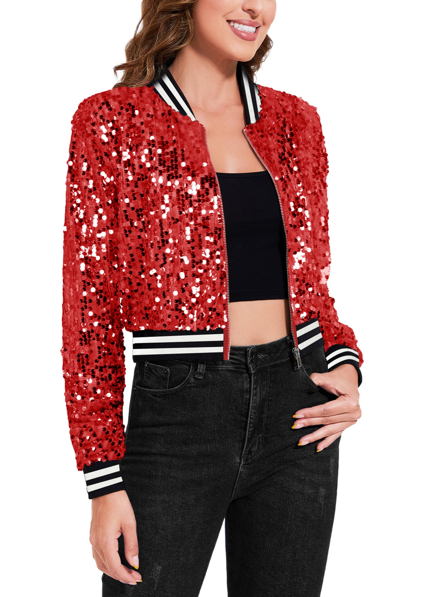 SPARKLY SEQUIN CROPPED JACKET. This sparkle bomber jacket is made of lightweight polyester material and embellished sparkle sequins, has a soft full lining that keeps you comfortable.