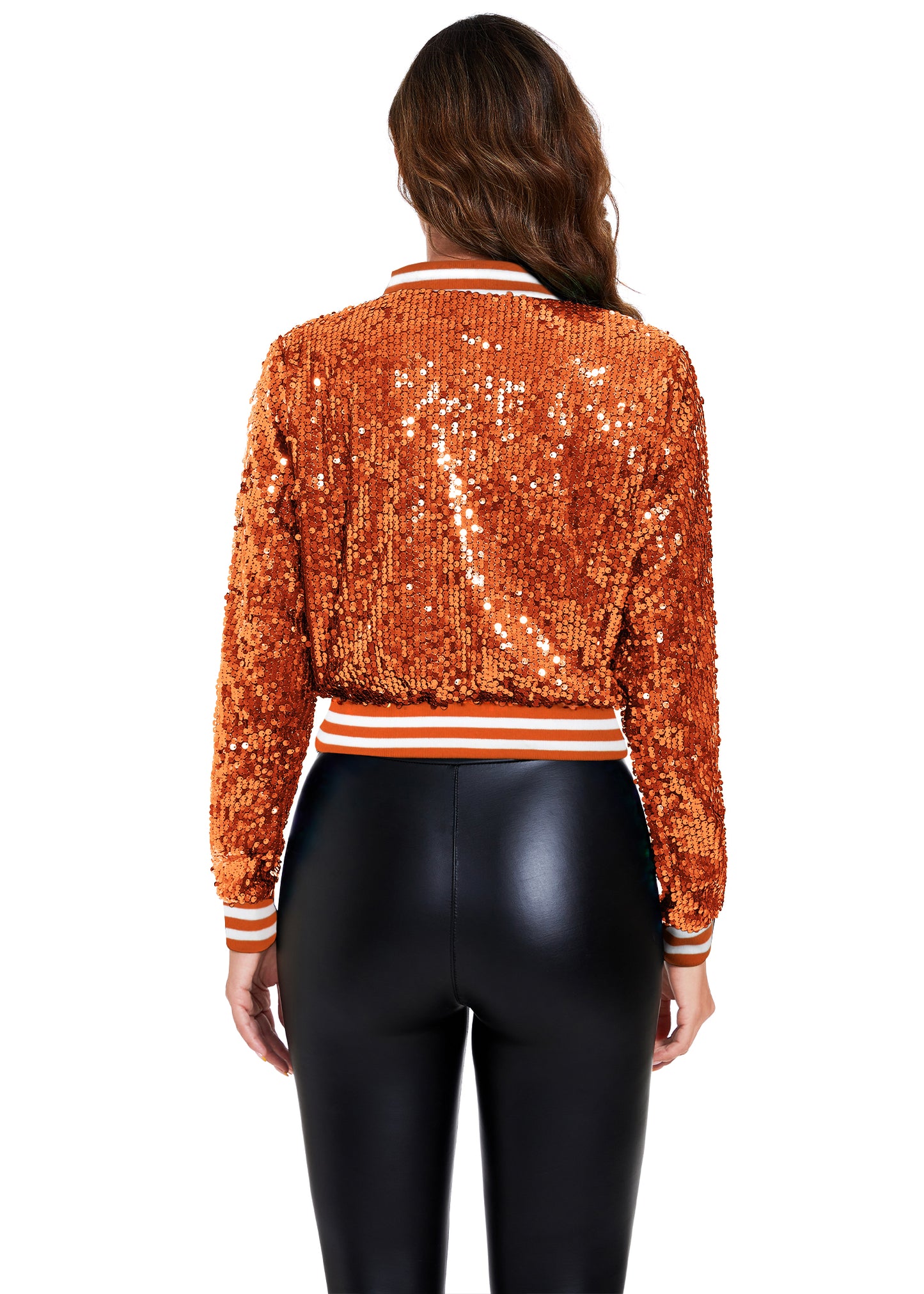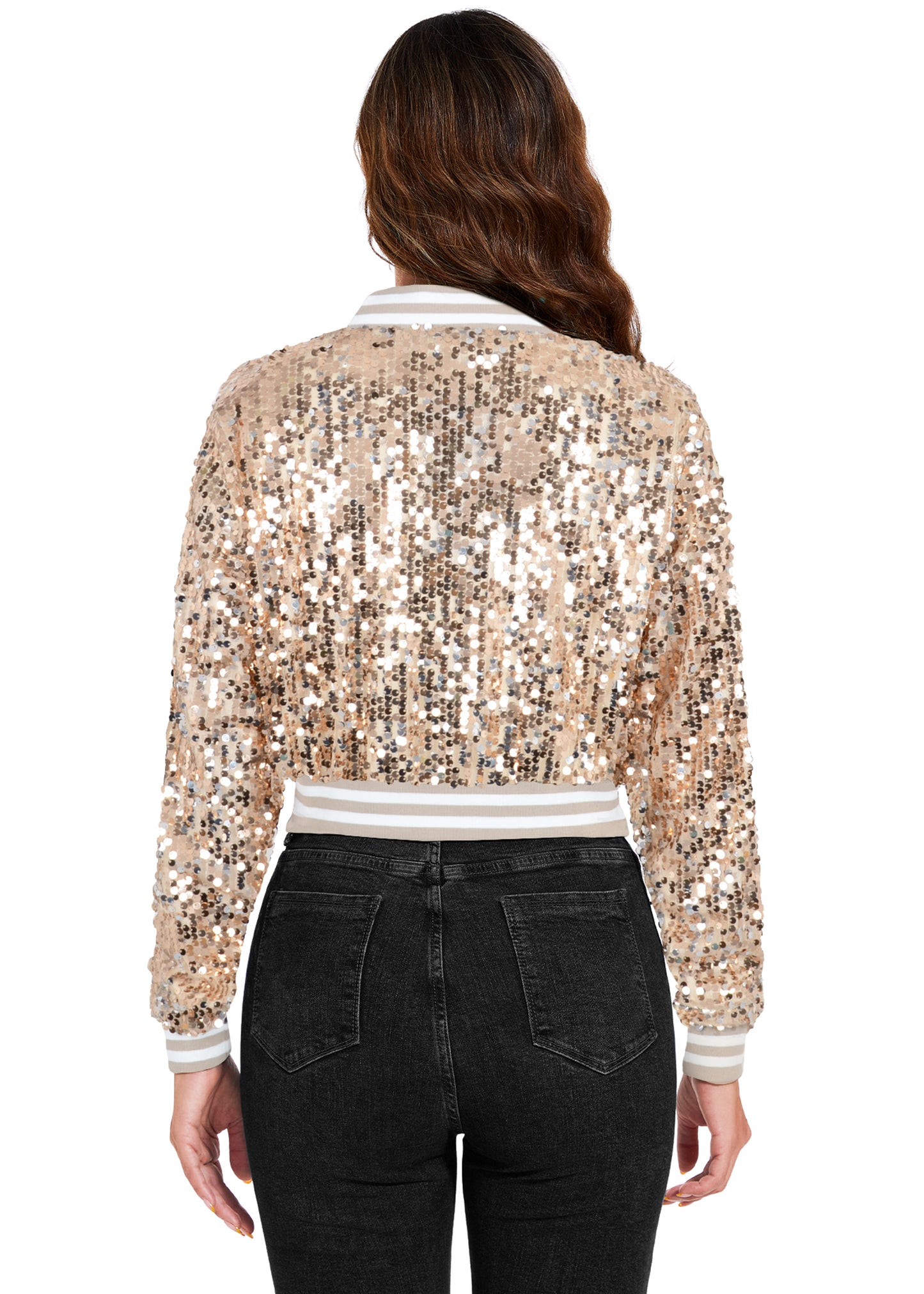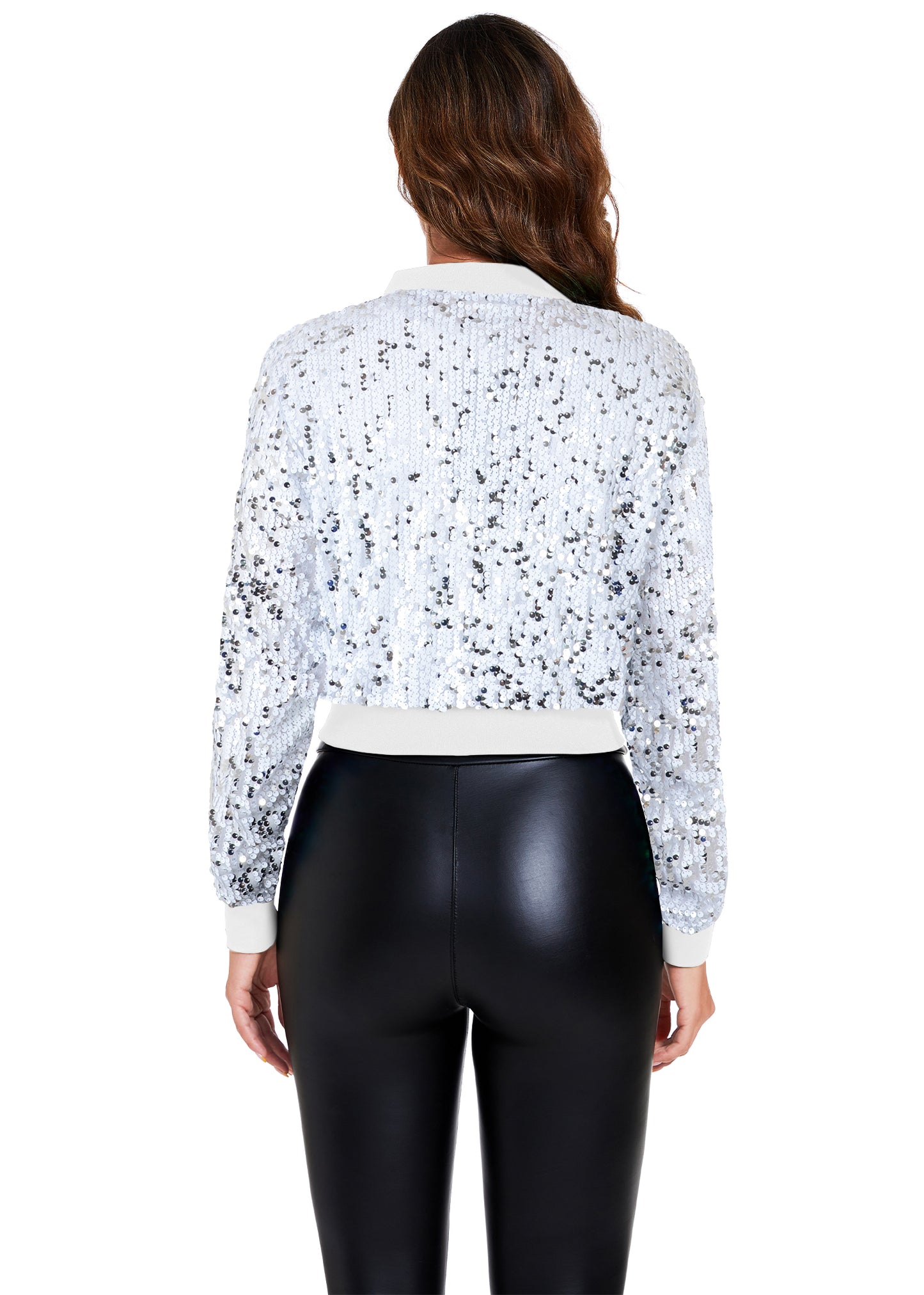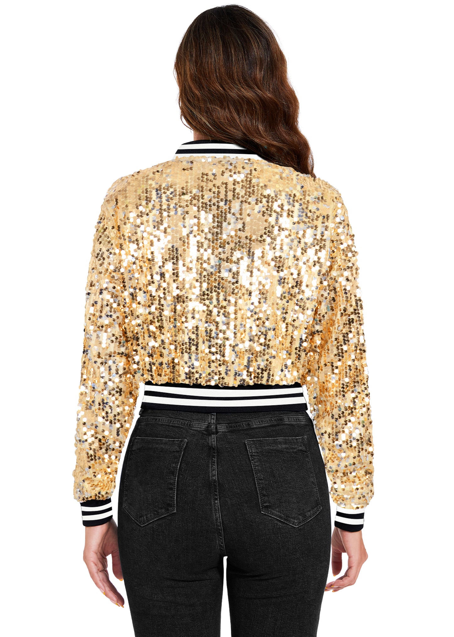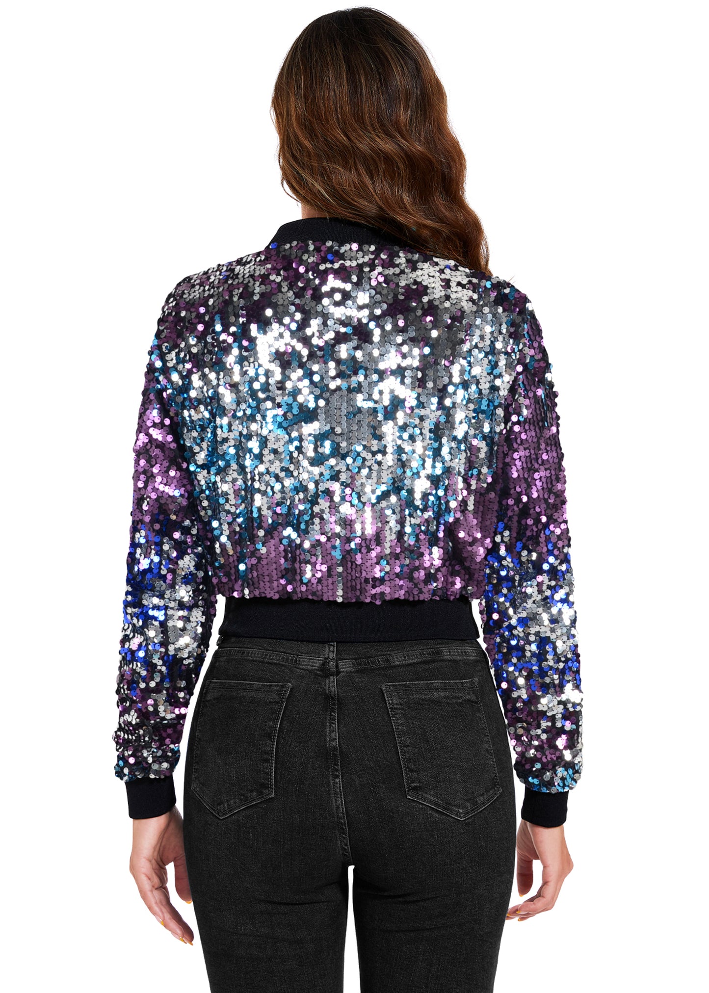 SPARKLY SEQUIN CROPPED JACKET. This sparkle bomber jacket is made of lightweight polyester material and embellished sparkle sequins, has a soft full lining that keeps you comfortable.