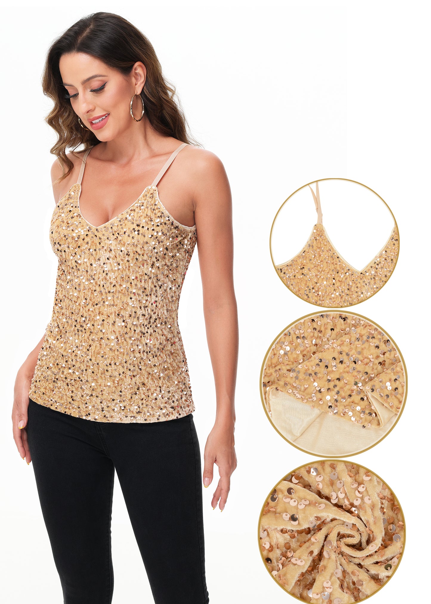 Anna-Kaci Womens Sleeveless Sequin Tops V Neck Sparkle Spaghetti Strap Cami Tank Top Shirt