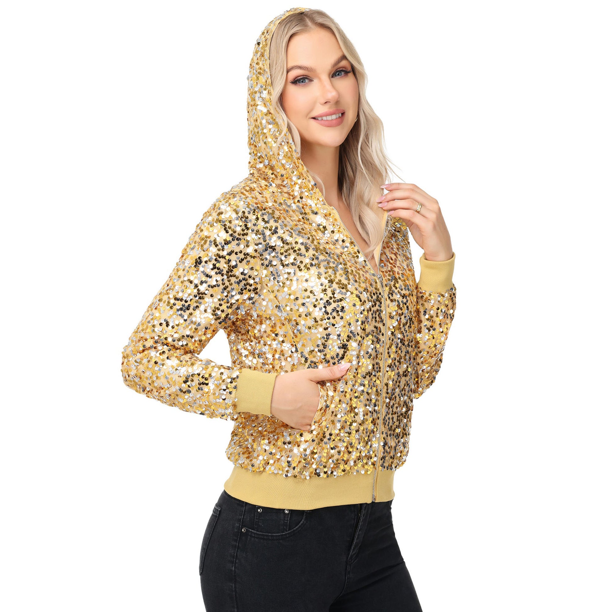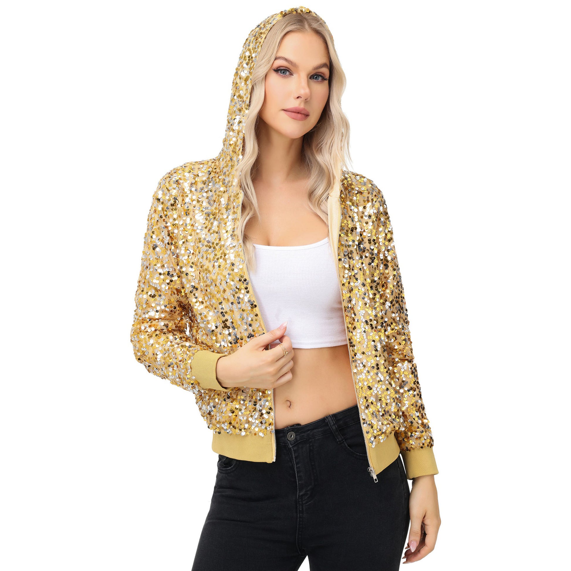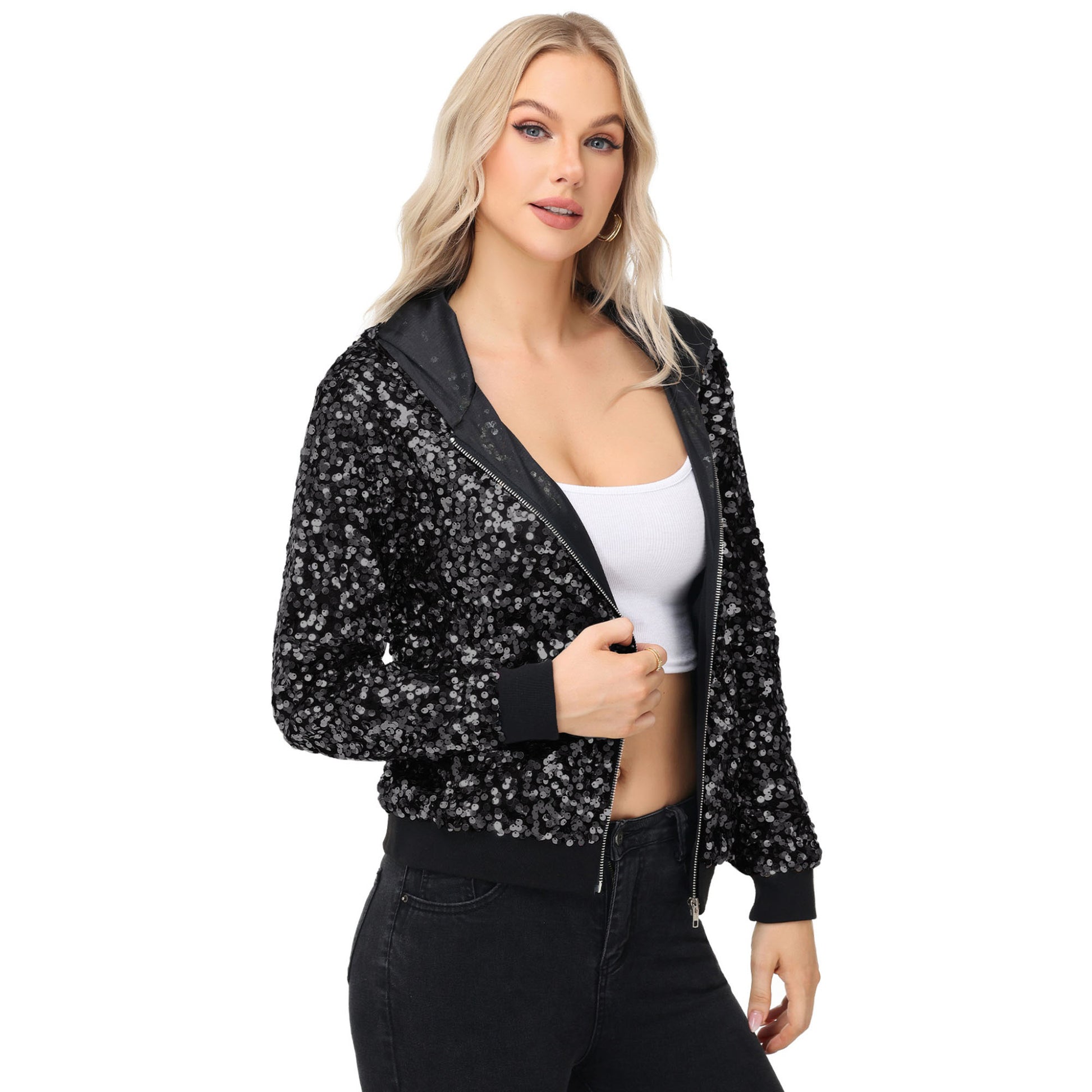 Turn heads wherever you go with the Anna-Kaci Sparkle Sequin Hooded Jacket ¡ª a dazzling blend of fashion and function. This glitter zip-up bomber jacket is designed to shine at concerts, birthdays, Halloween, Christmas, cosplay events, and more.