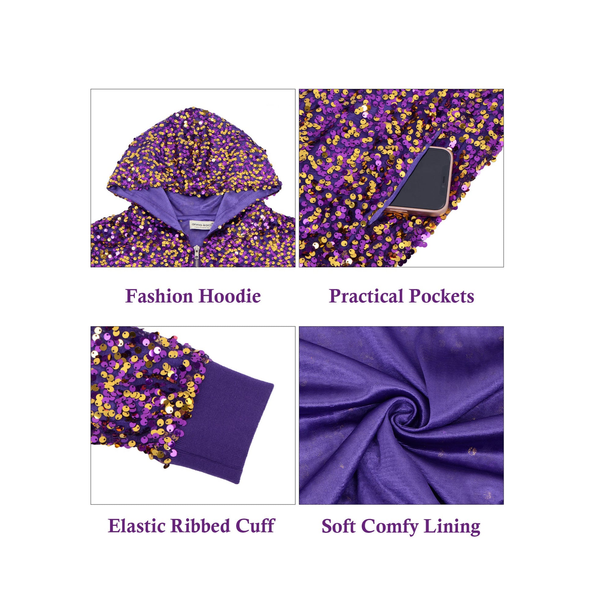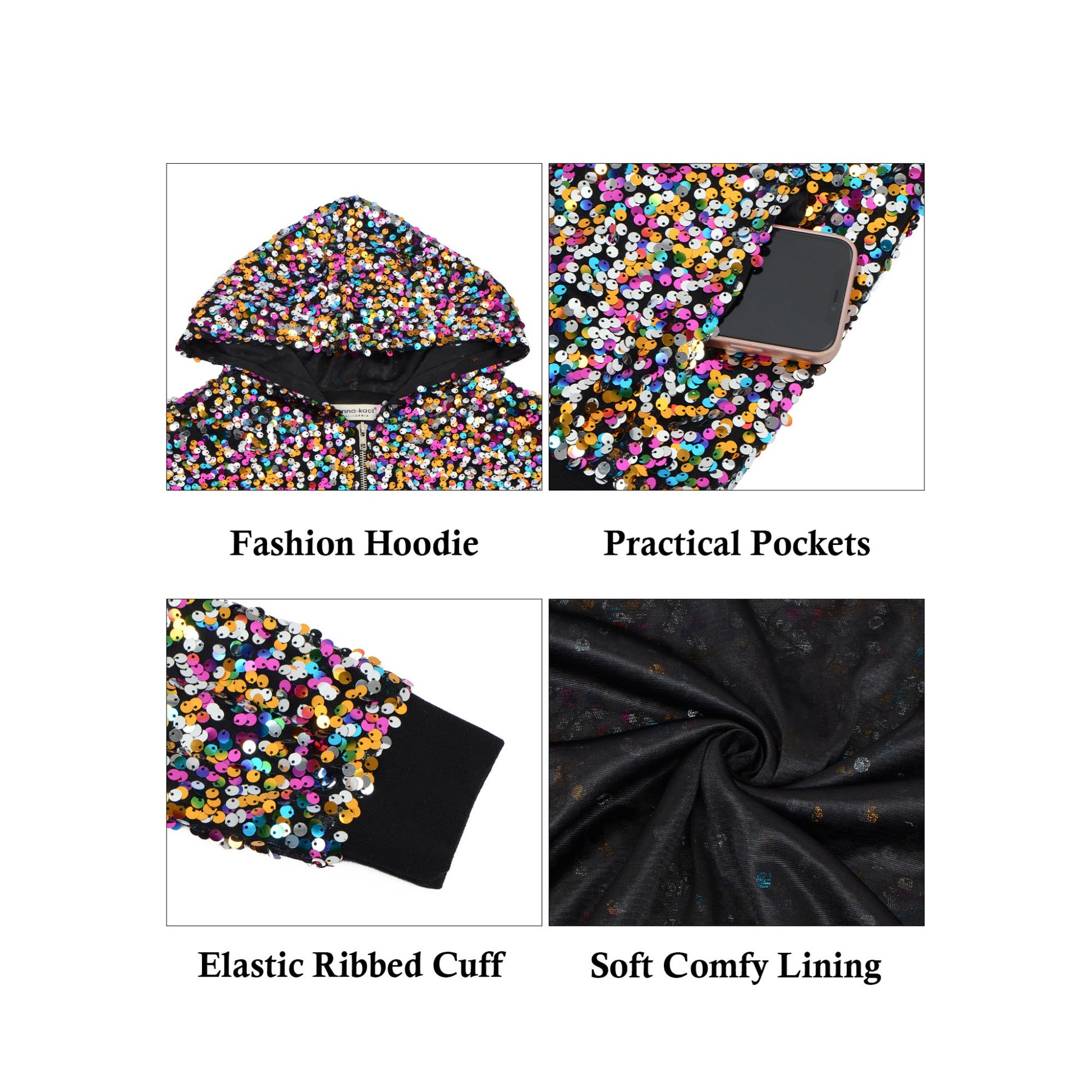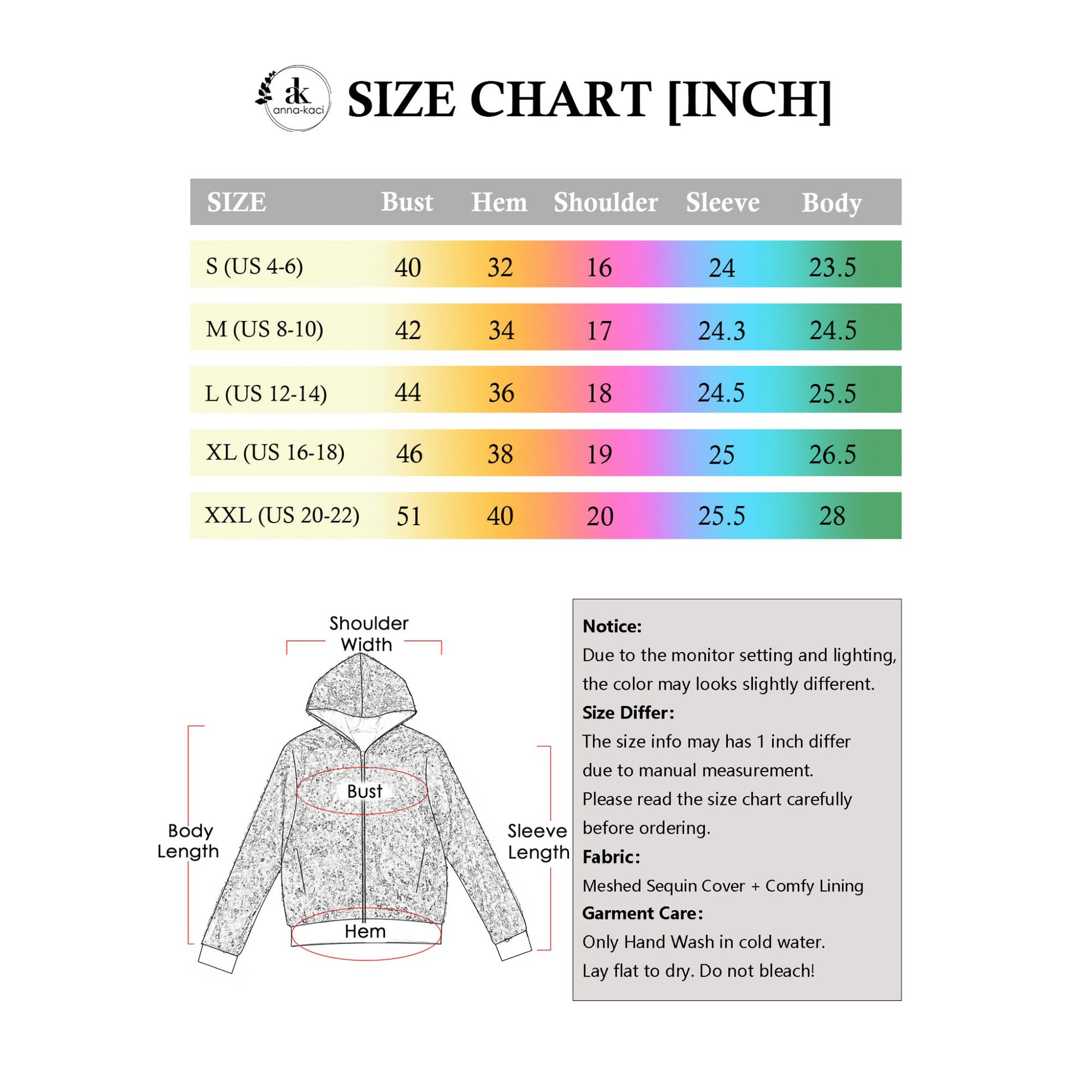 Turn heads wherever you go with the Anna-Kaci Sparkle Sequin Hooded Jacket ¡ª a dazzling blend of fashion and function. This glitter zip-up bomber jacket is designed to shine at concerts, birthdays, Halloween, Christmas, cosplay events, and more.