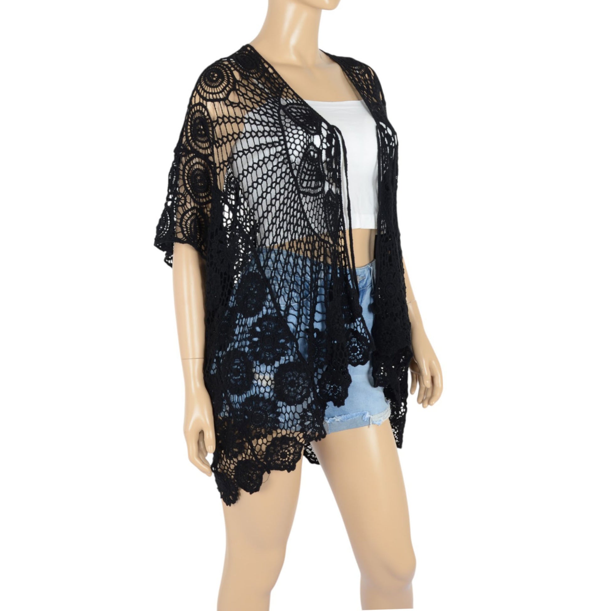 This open-front crochet kimono cardigan features intricate floral lace patterns and scalloped edges that add a touch of bohemian charm. Designed with a lightweight, breathable weave, it's perfect for layering over swimwear or casual tops. The short sleeves and relaxed fit ensure comfort and versatility, making it ideal for beach days, vacation outfits, or breezy summer evenings. Elevate your look effortlessly with this delicate, stylish layering piece.