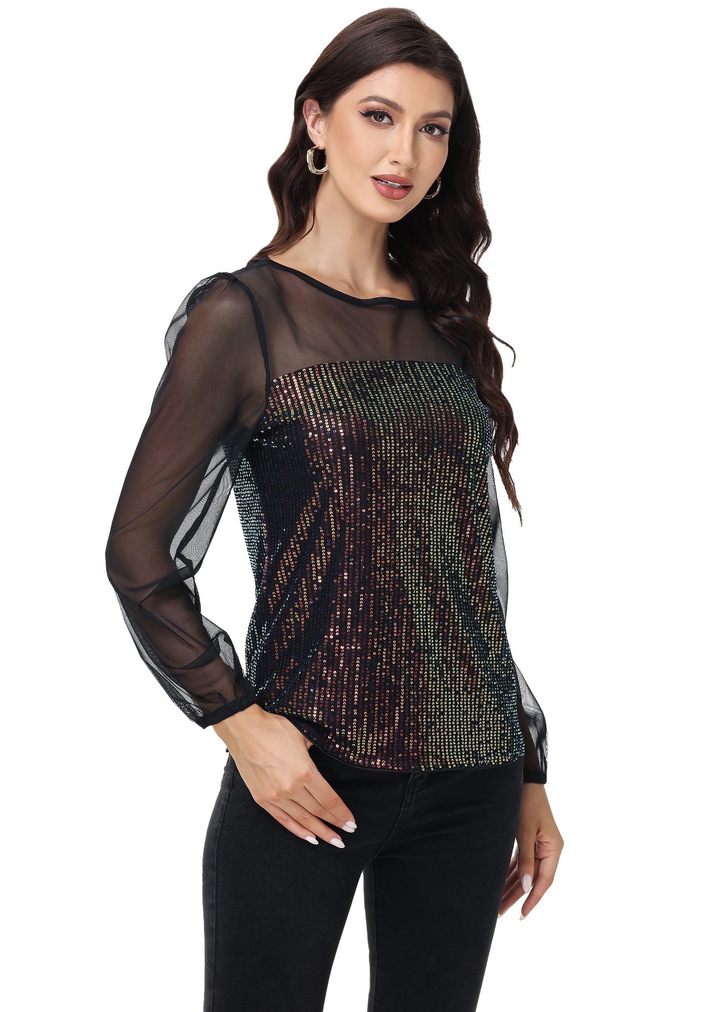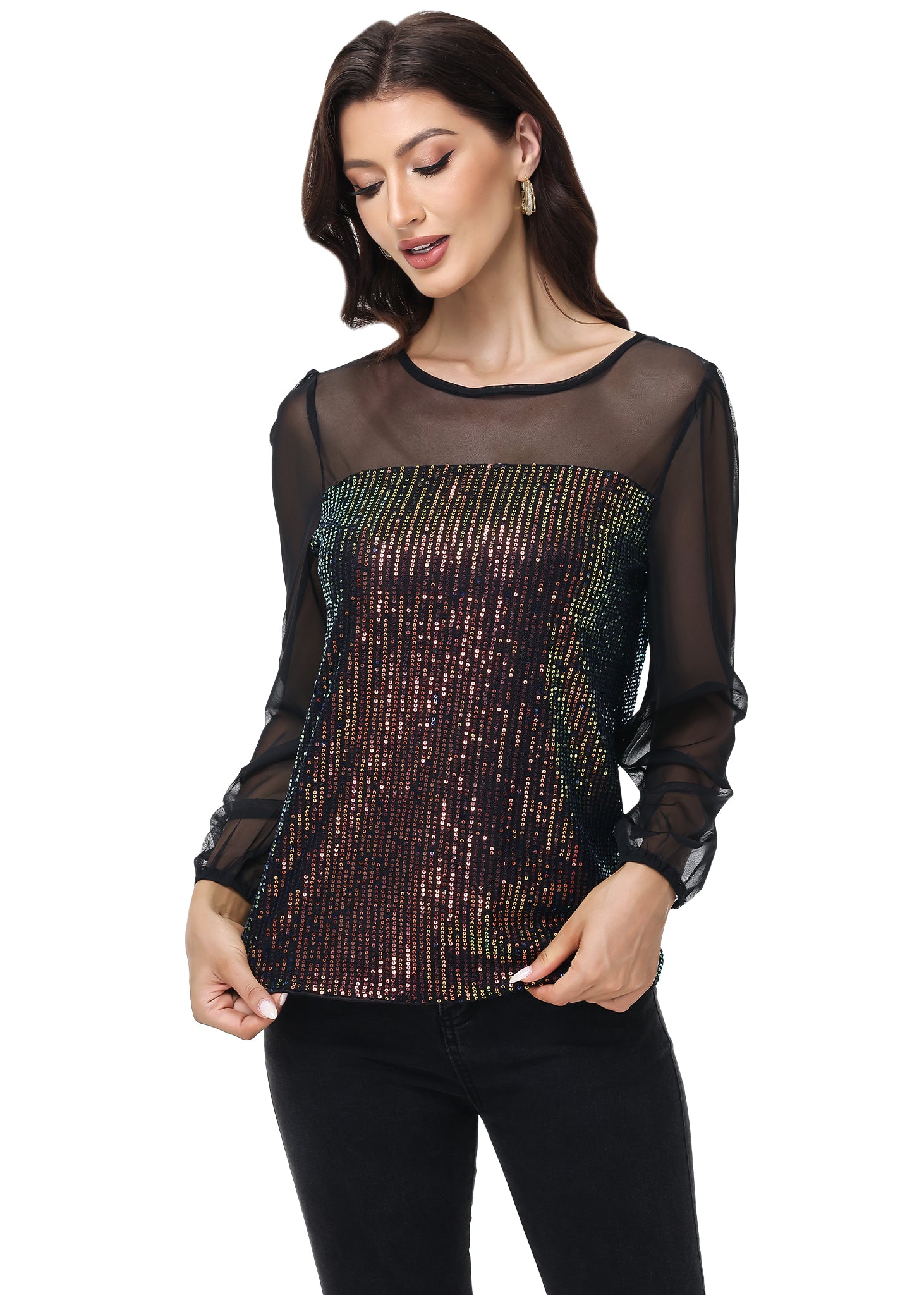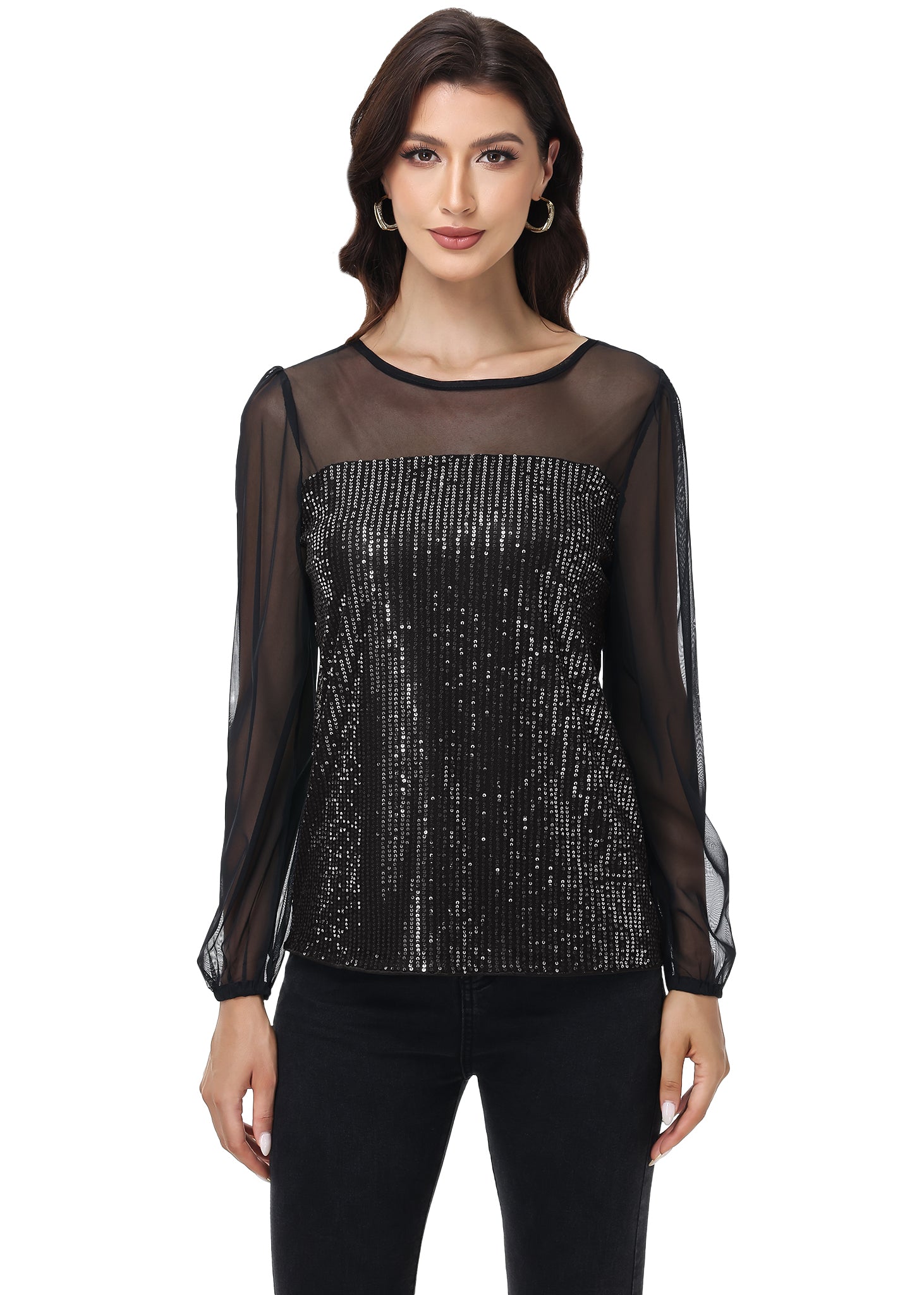 This stunning women's blouse features a shimmering sequin front panel paired with sheer chiffon long sleeves for an elegant and festive look. The soft, flowy design is perfect for dressing up any outfit while offering comfort and sophistication.