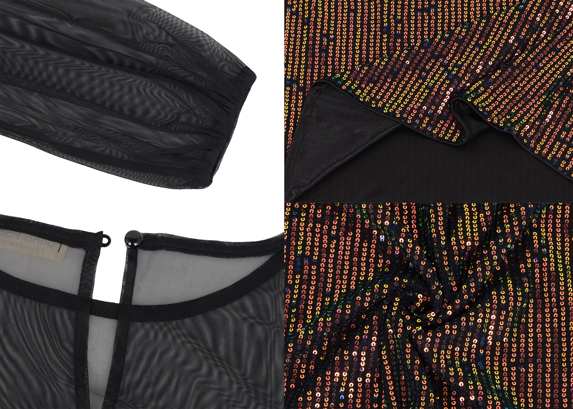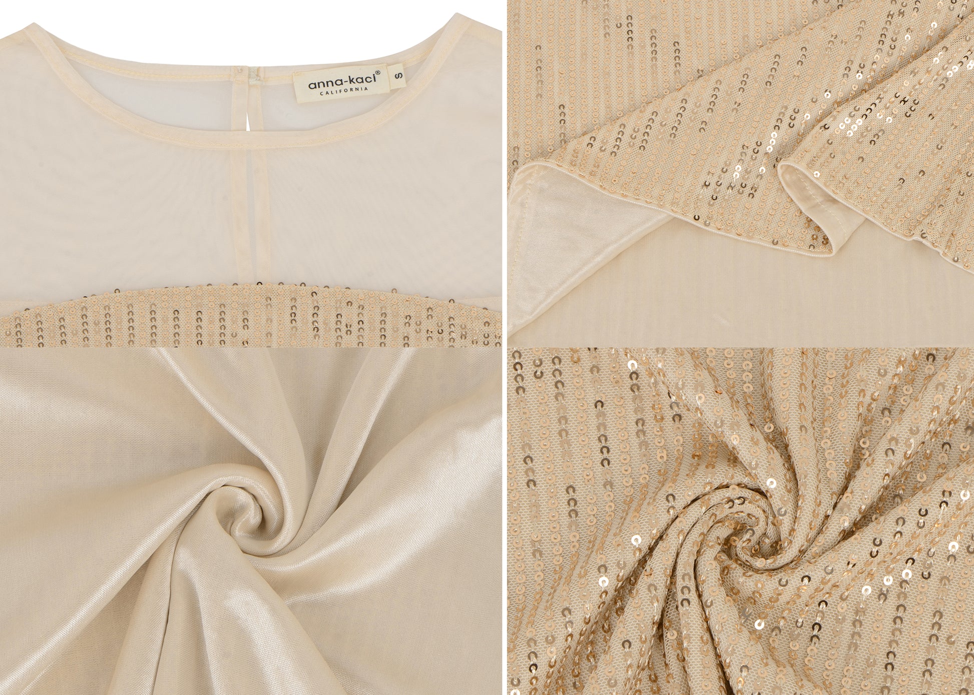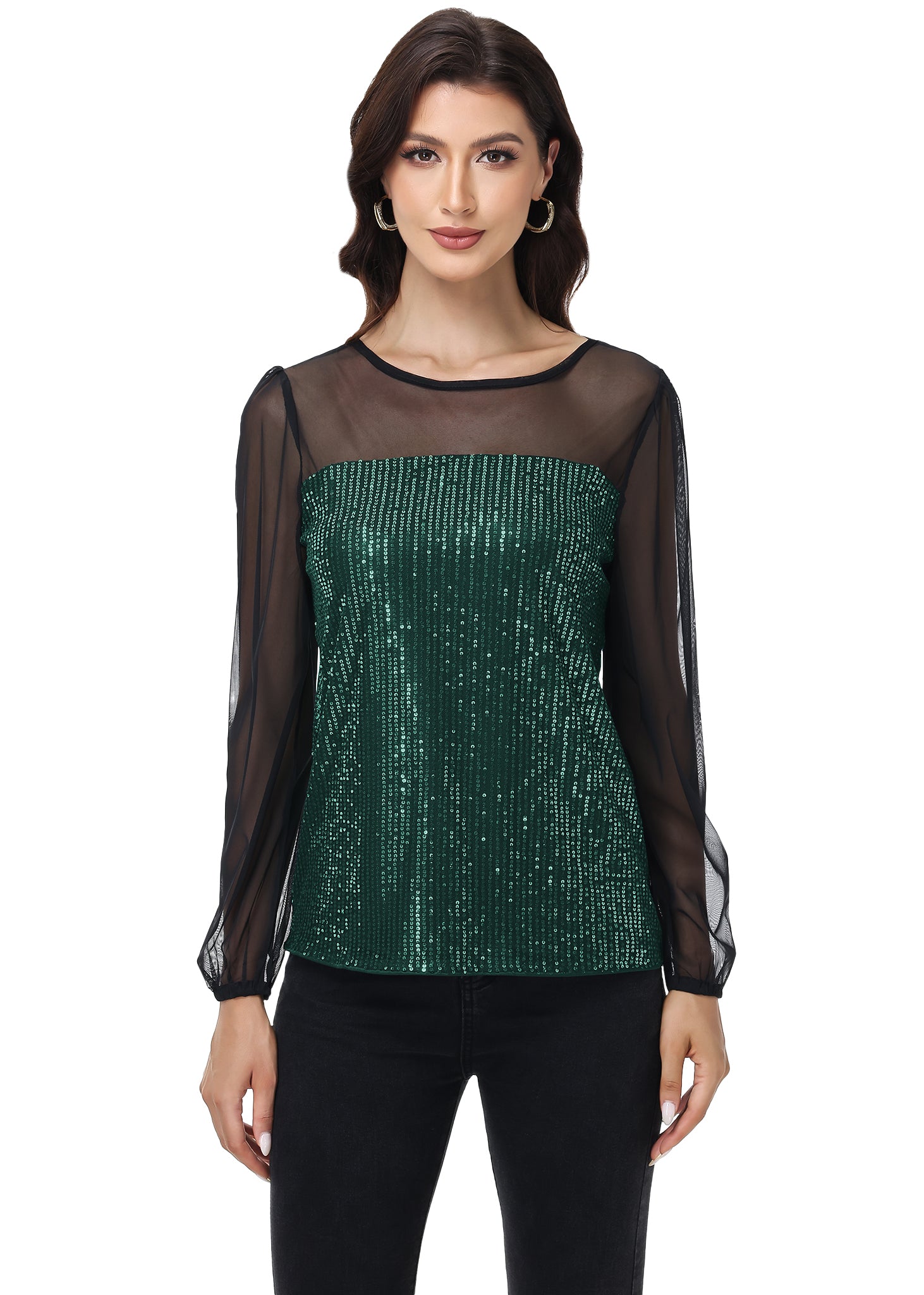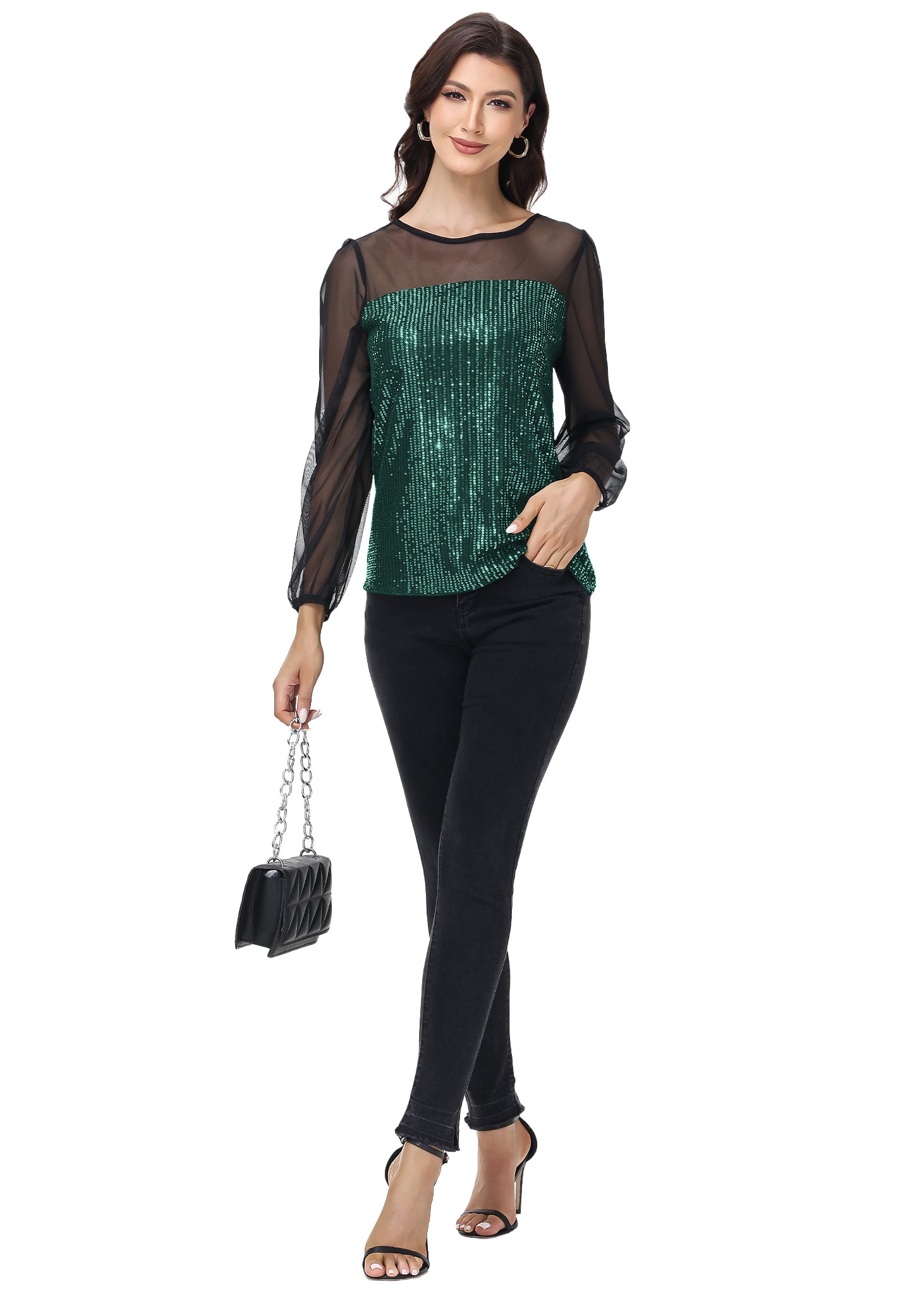 This stunning women's blouse features a shimmering sequin front panel paired with sheer chiffon long sleeves for an elegant and festive look. The soft, flowy design is perfect for dressing up any outfit while offering comfort and sophistication.