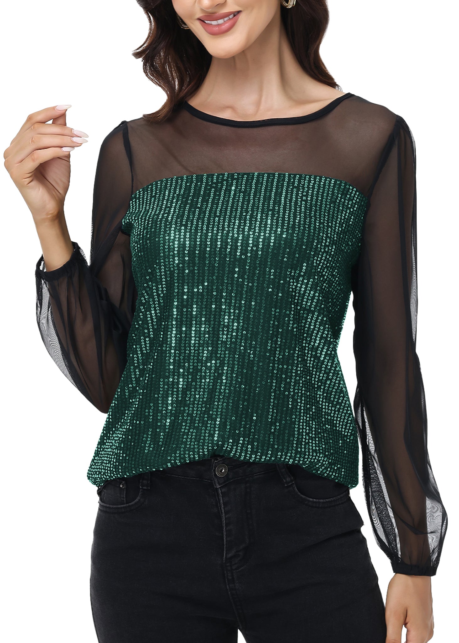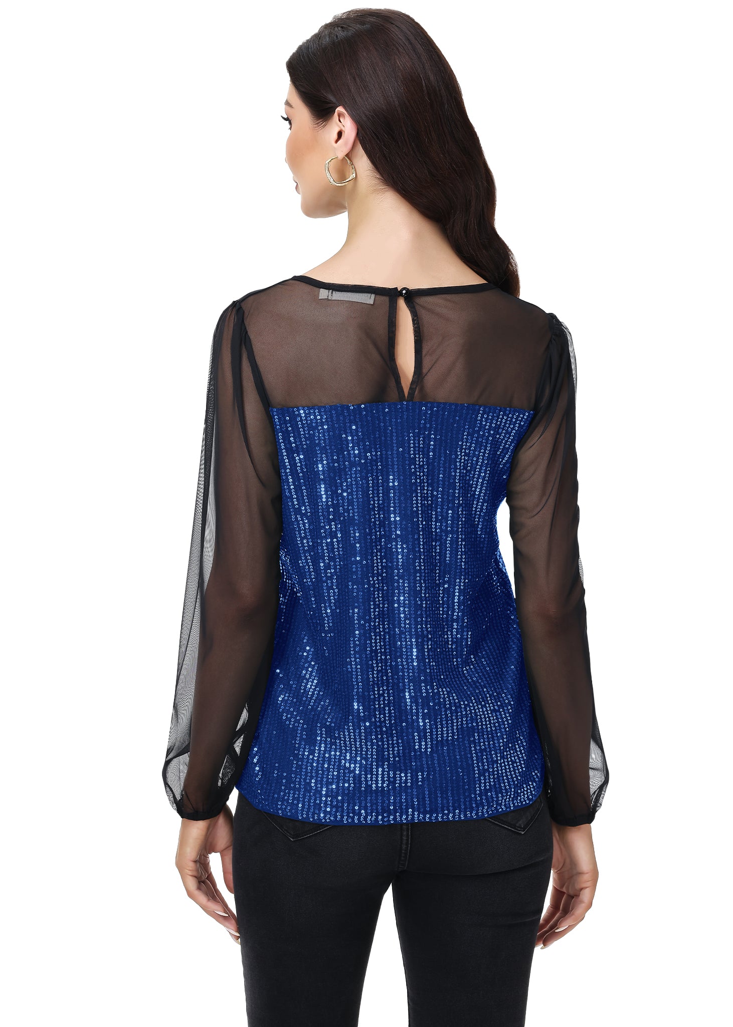 Anna-Kaci Women's Long Sleeve Sequin Blouse Sheer Mesh Top Sparkly Shirt for Holiday Party